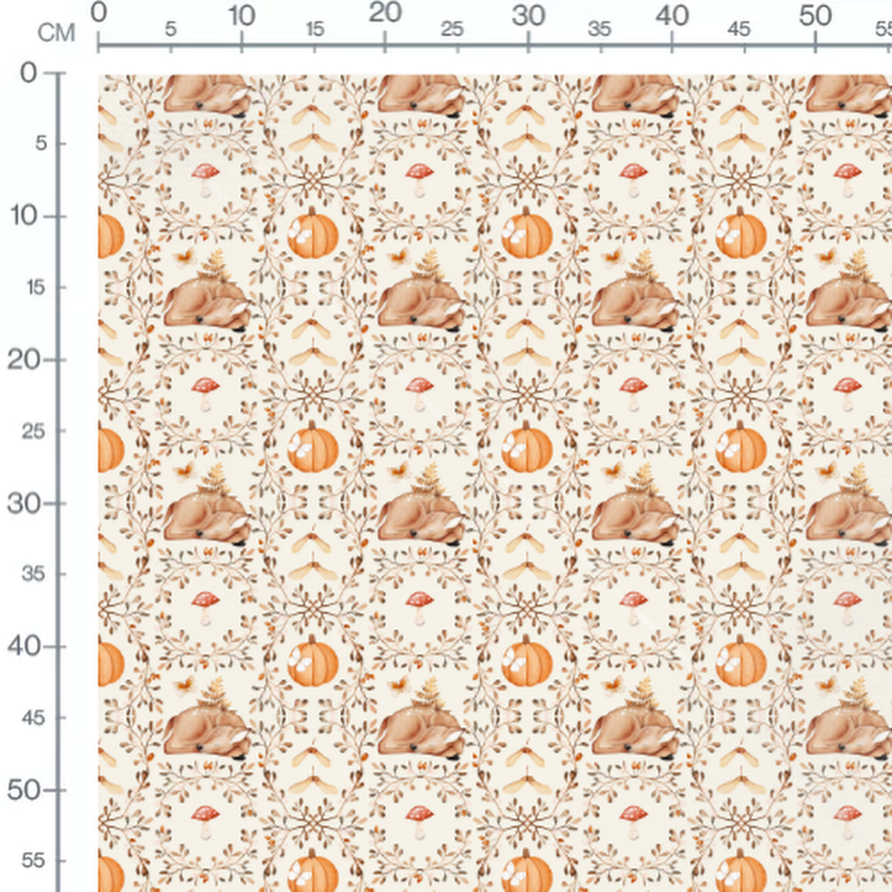 Les faons sont entourés de branches aux feuilles brunes et de citrouilles. Des champignons rouges à pois blancs ajoutent une touche de couleur. Des papillons et des fougères complètent le motif automnal.Les tissus