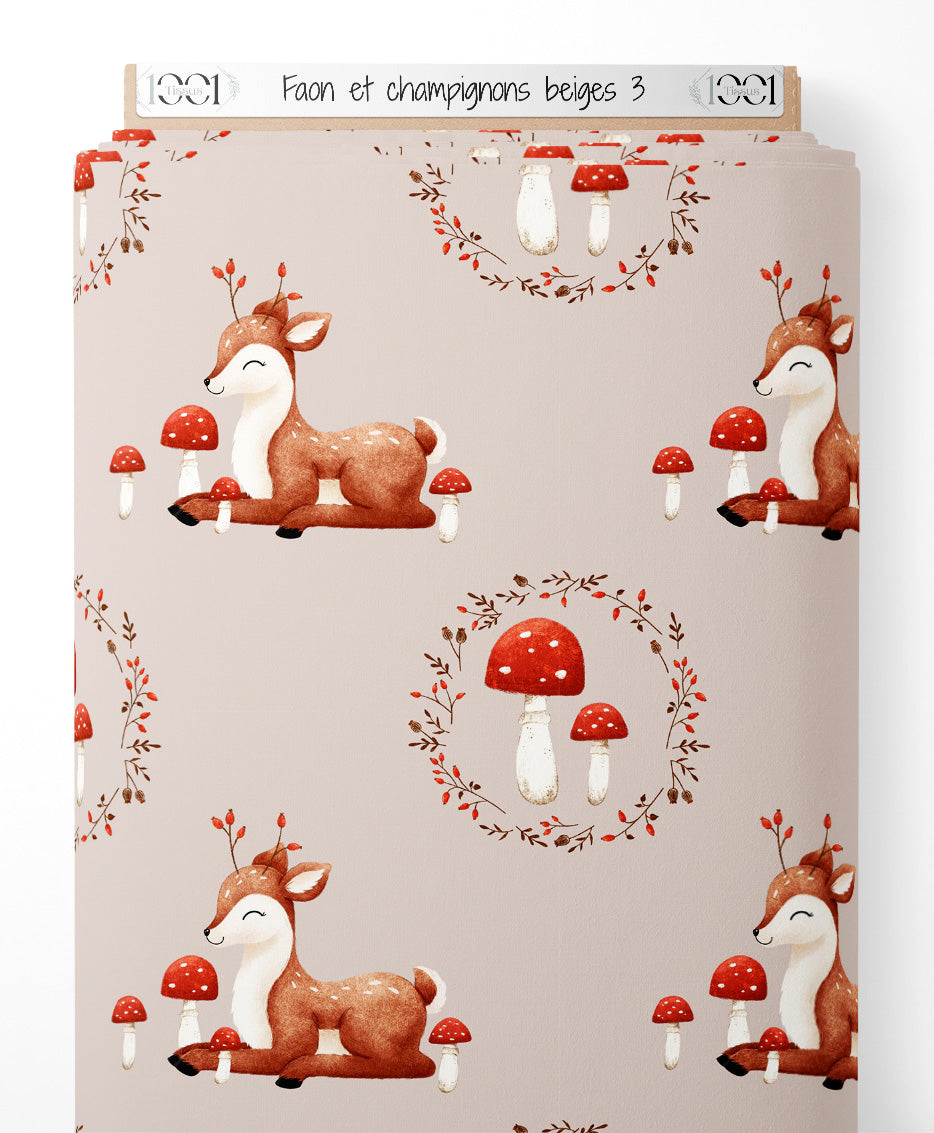 Tissu - Faon et champignons beiges 3