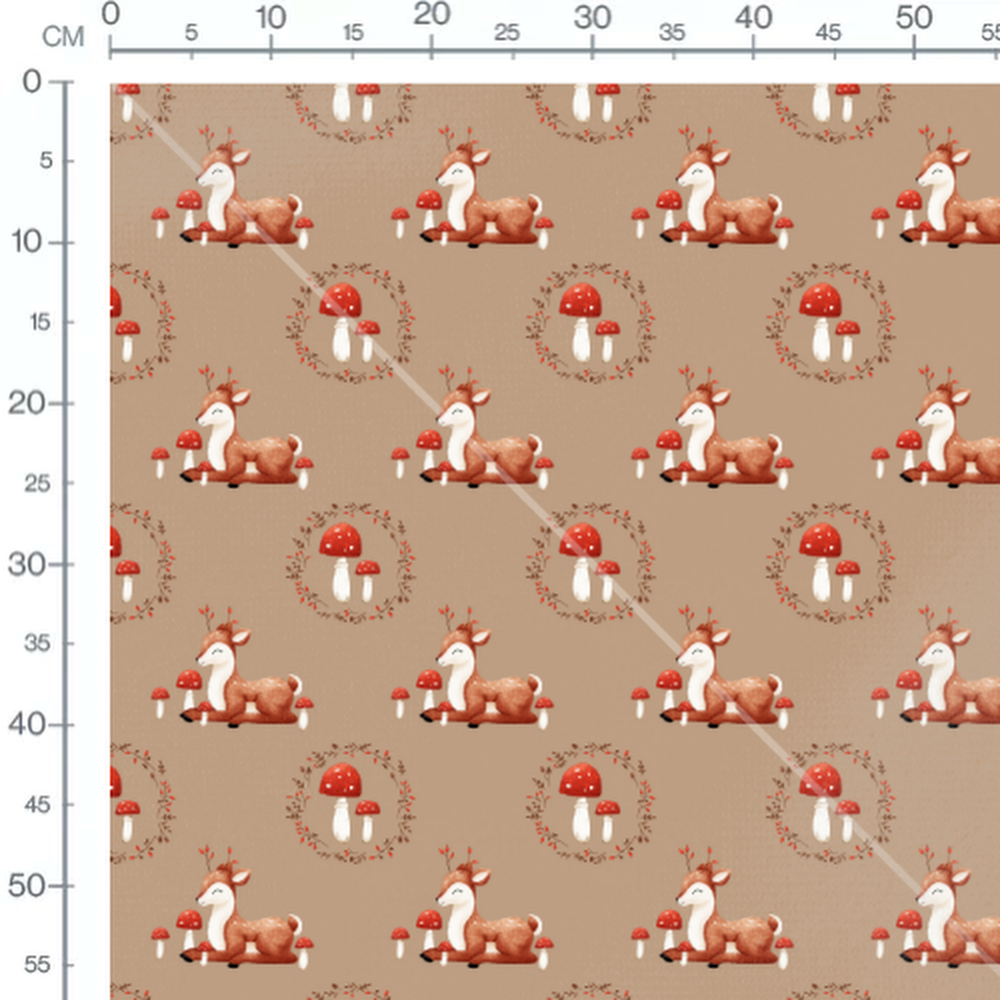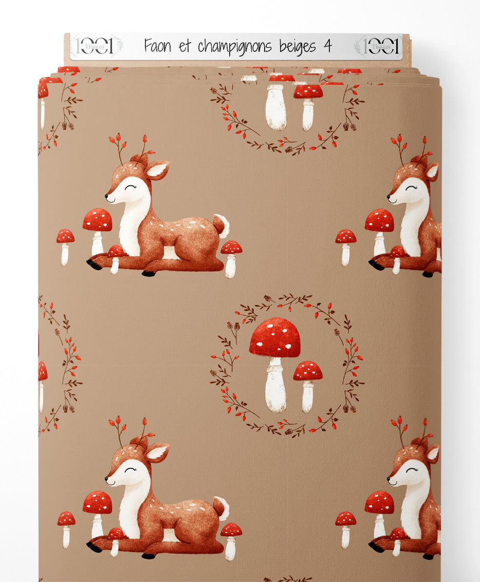 Le faon est assis paisiblement parmi les champignons. Les champignons sont de couleur rouge avec des taches blanches. Les branches décoratives ajoutent une touche de nature au motif.Les tissus