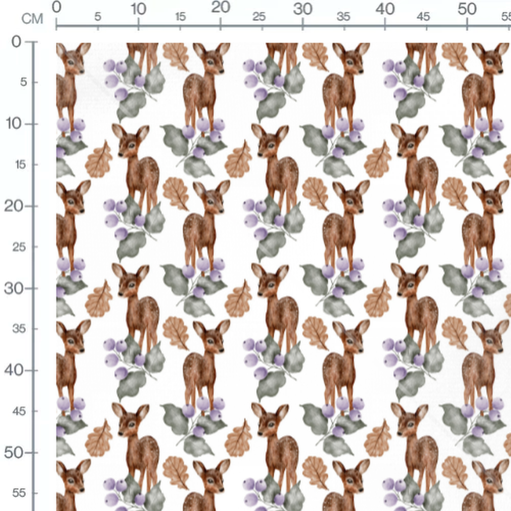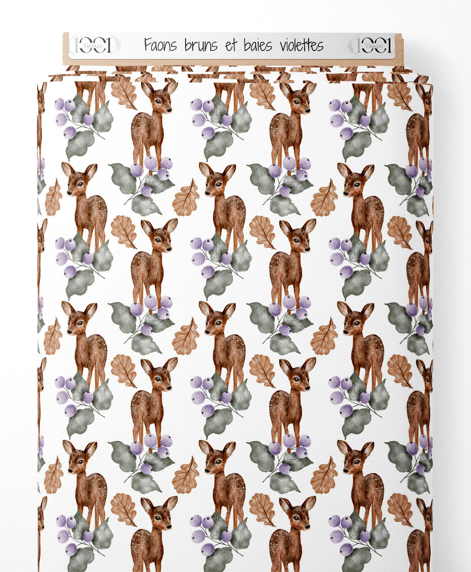 Les faons bruns sont délicatement illustrés avec des détails blancs sur leur pelage. Les baies violettes ajoutent une touche de couleur vive. Les feuilles marron et vertes complètent le motif avec une touche naturelle.Les tissus