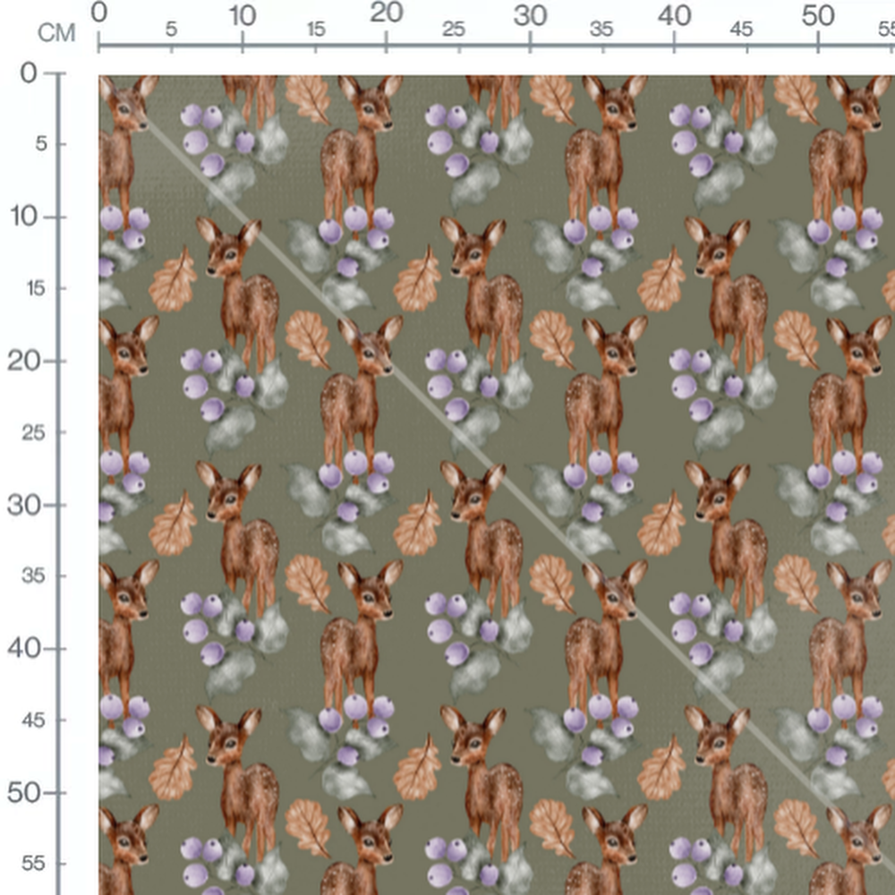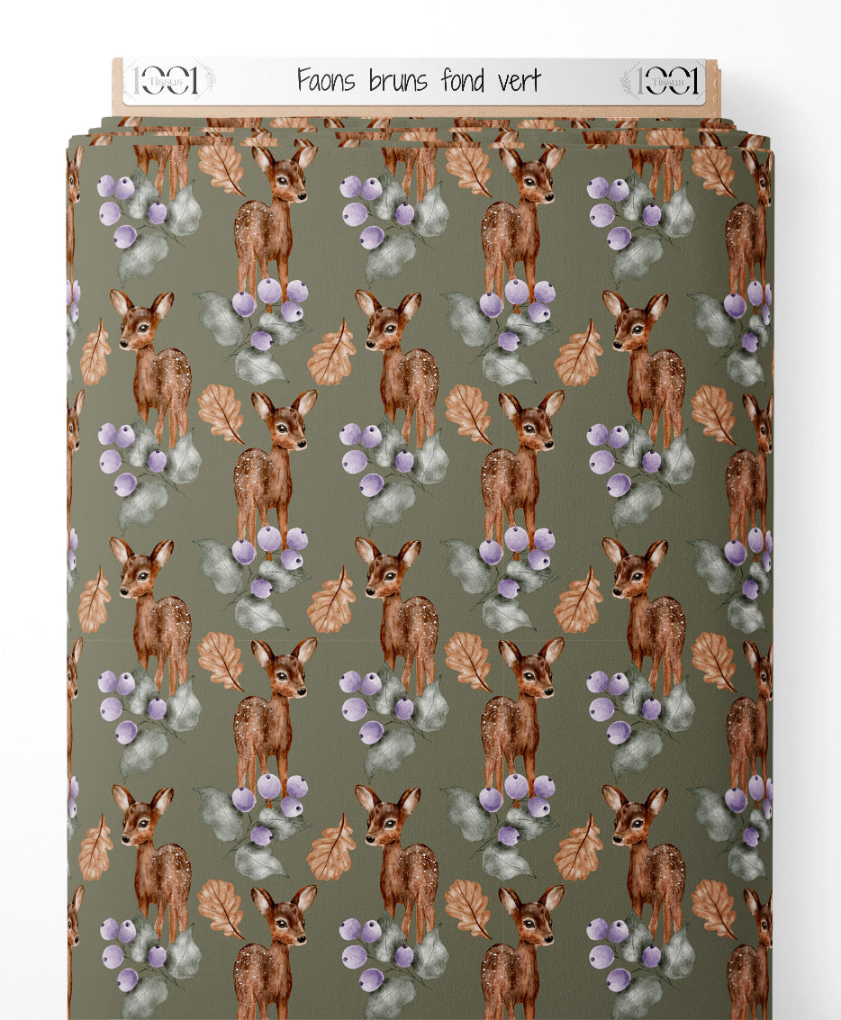 Les faons bruns sont entourés de petites baies violettes. Des feuilles marron et grises ajoutent une touche naturelle au design. Le fond vert complète l'ambiance forestière.Les tissus