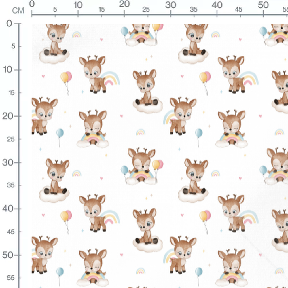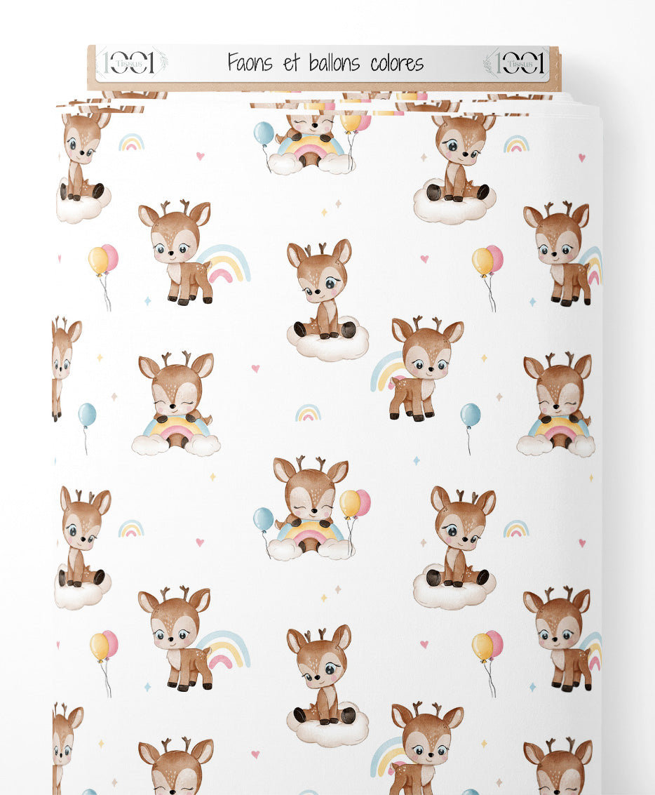 Les faons sont accompagnés de ballons roses, jaunes et bleus. Des arcs-en-ciel pastel ajoutent une touche de couleur douce. Les nuages blancs apportent une ambiance rêveuse.Les tissus