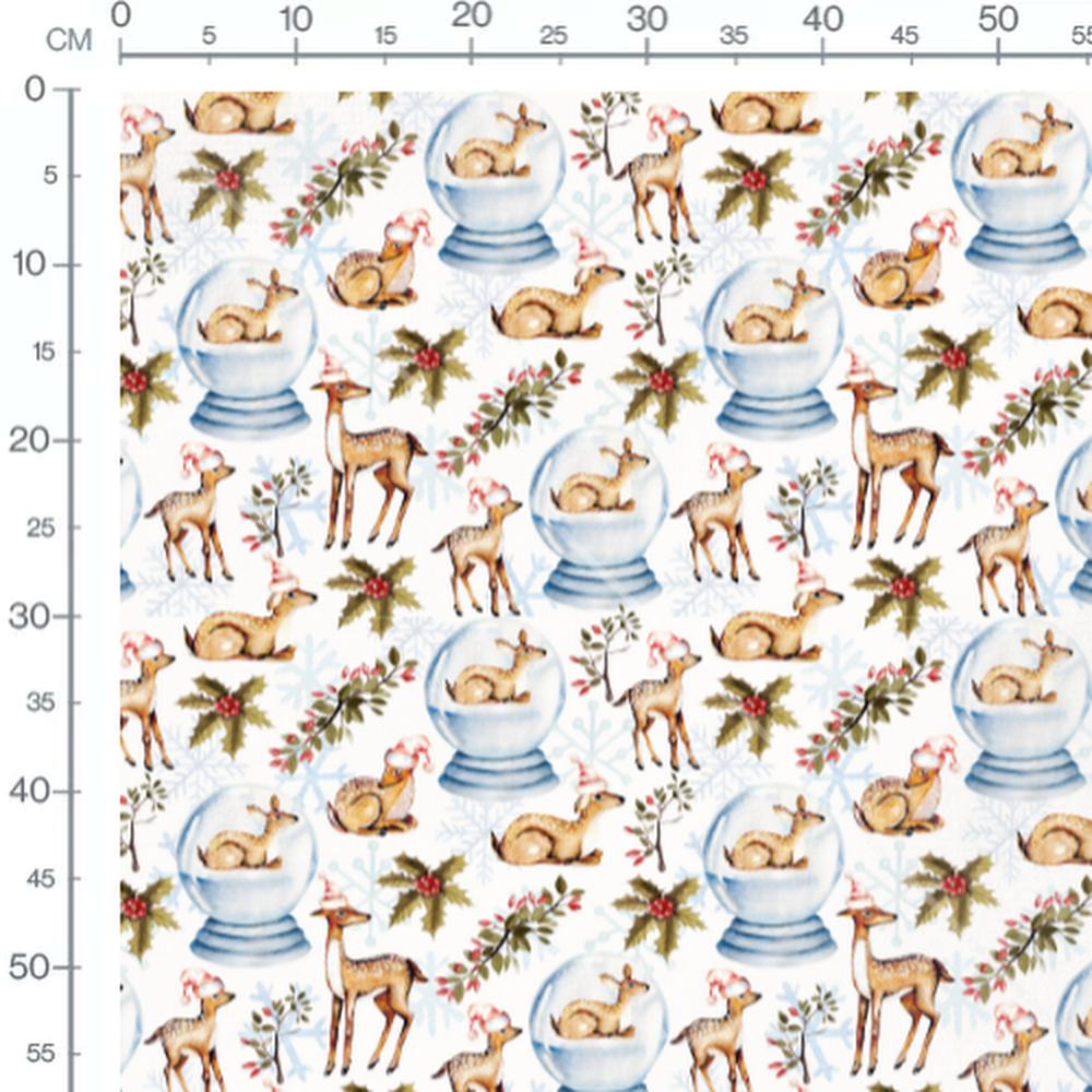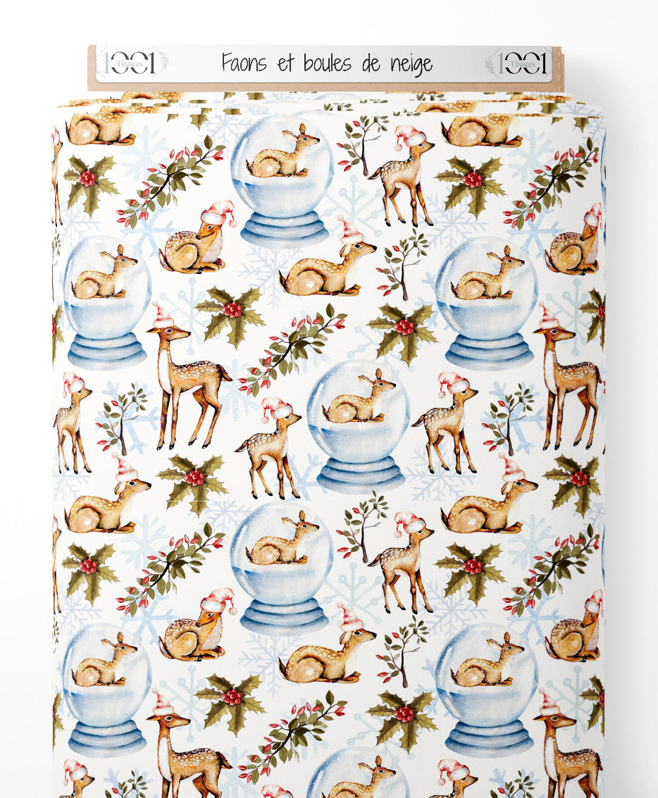 Les faons portent des chapeaux rouges festifs. Des boules de neige transparentes contiennent des faons. Des branches de houx avec des baies rouges ajoutent une touche de couleur.Les tissus