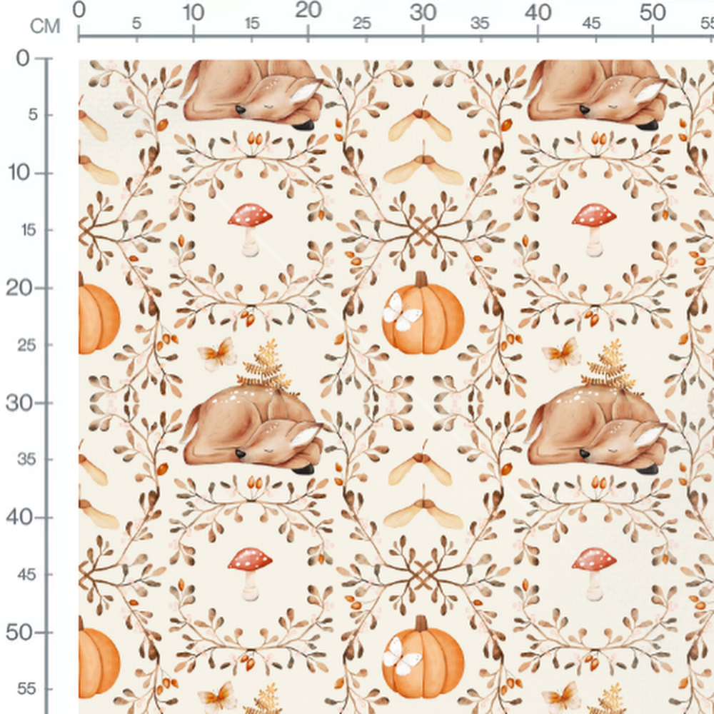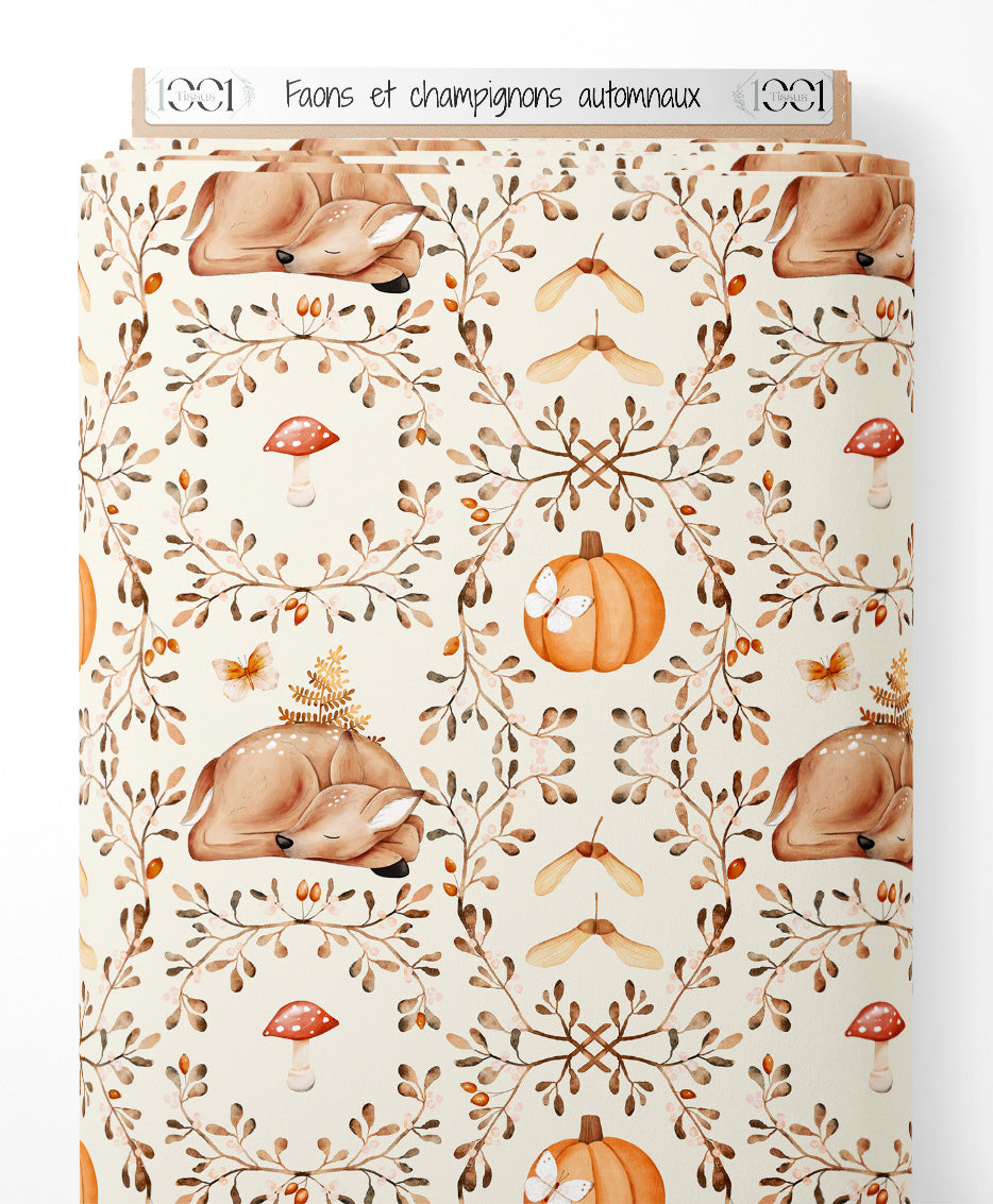 Papillons blancs et feuilles dorées ajoutent une touche délicate. Les branches sont ornées de petites baies brunes. Les citrouilles et les champignons apportent une ambiance automnale.Les tissus