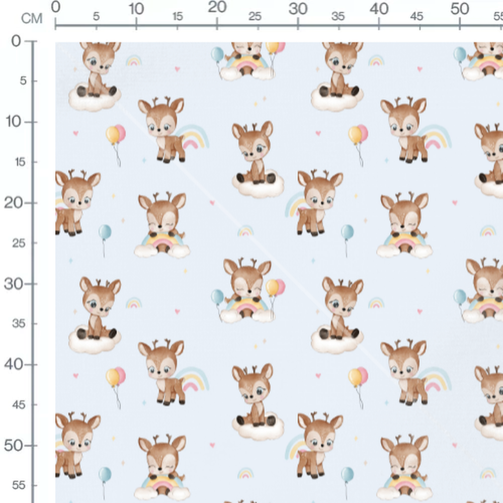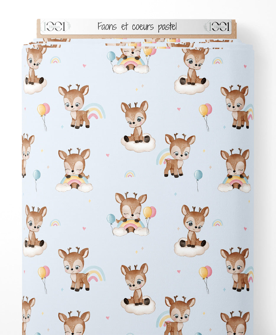 Les faons sont accompagnés de ballons de différentes couleurs. Des arcs-en-ciel pastel ajoutent une touche de couleur. De petits cœurs roses et jaunes sont dispersés sur le fond. Les nuages blancs apportent une douceur au motif.Les tissus