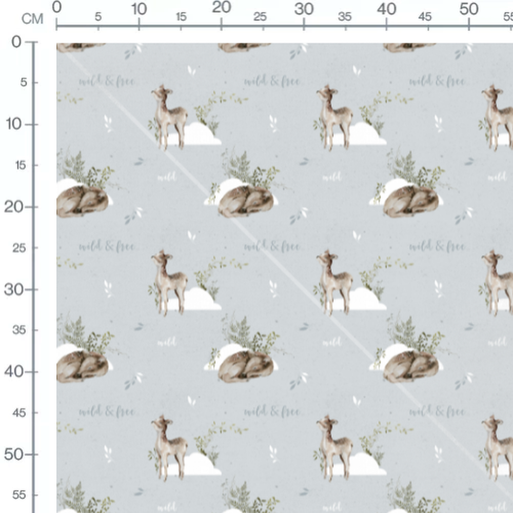 Les faons sont entourés de petites branches de feuillage vert. Des nuages blancs parsèment le fond gris. Le texte 'wild & free' est intégré au motif.Les tissus