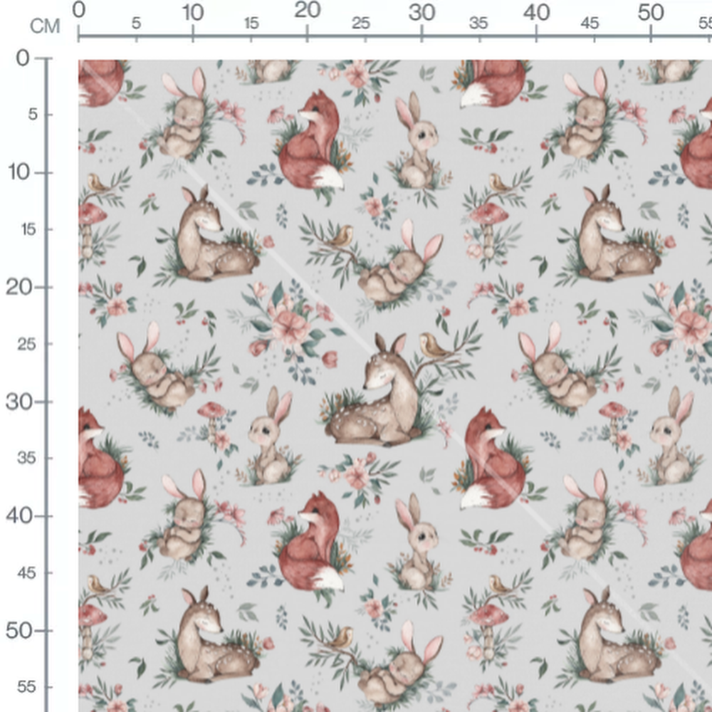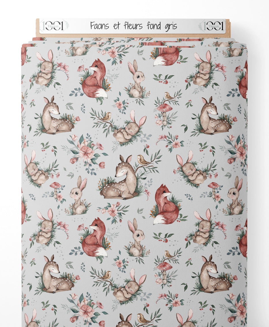 Les lapins sont dessinés dans des tons doux et reposent paisiblement. Les renards sont enroulés, ajoutant une touche chaleureuse. Les faons sont couchés, entourés de feuillages. Des oiseaux posés sur des branches et des champignons rouges apportent une diversité naturelle. Les fleurs roses et les feuilles vertes ajoutent une touche florale au design.Les tissus