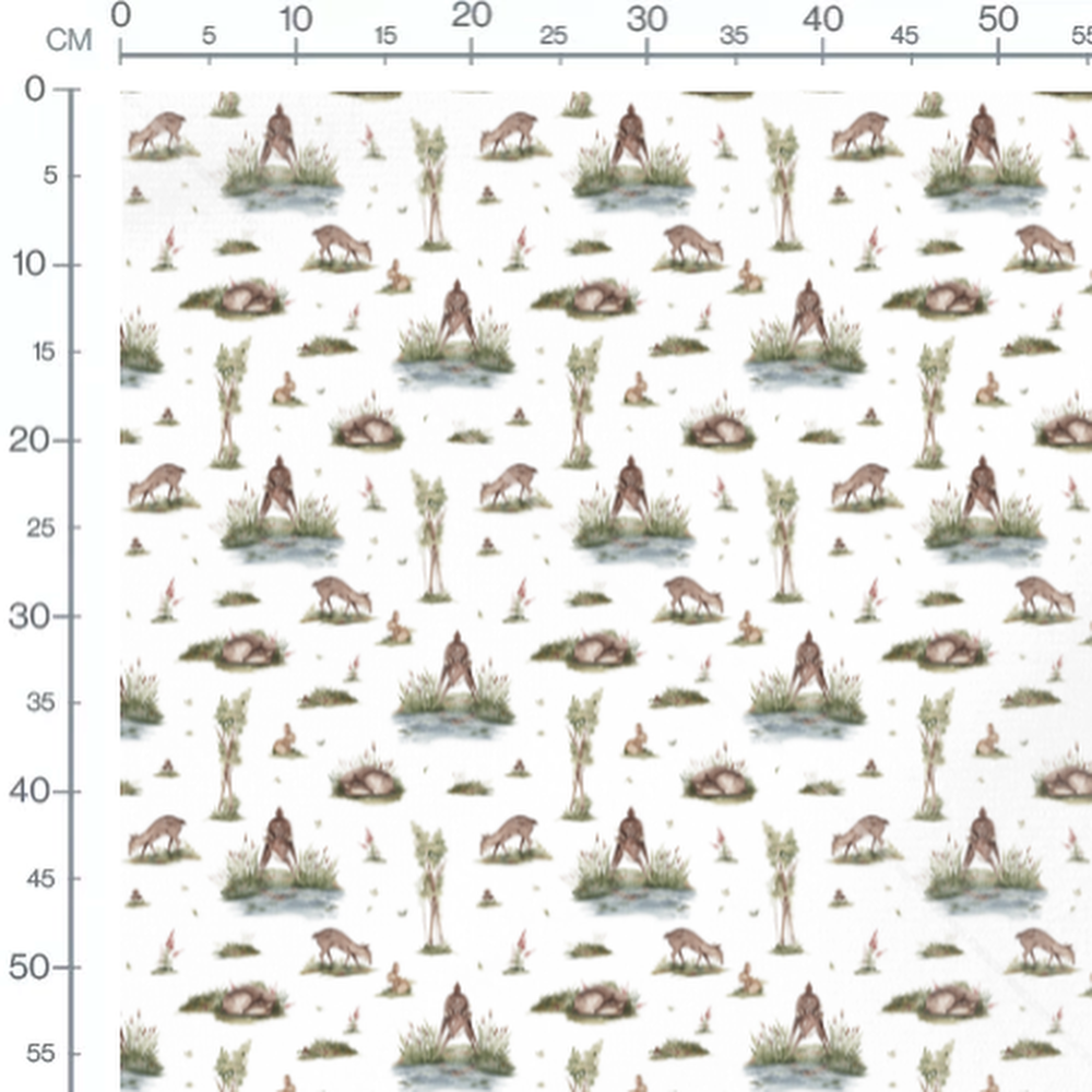 Les faons se tiennent près des mares d'eau entourées d'herbes. Les lapins sont assis paisiblement à côté des buissons. Quelques arbres et plantes complètent le paysage naturel.Les tissus