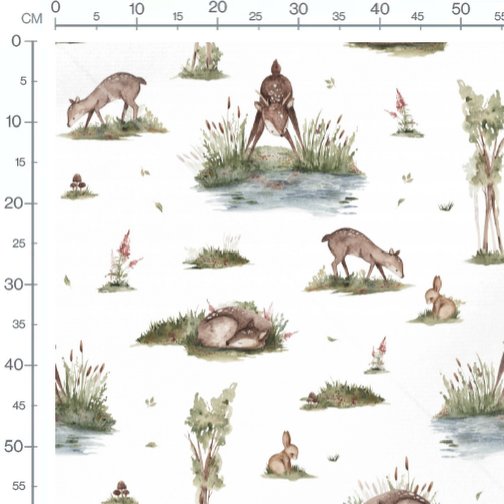 Les faons bruns se tiennent près des étangs avec des herbes vertes. Les lapins bruns sont assis parmi les touffes d'herbe. Quelques petites plantes rouges ajoutent une touche de couleur.Les tissus