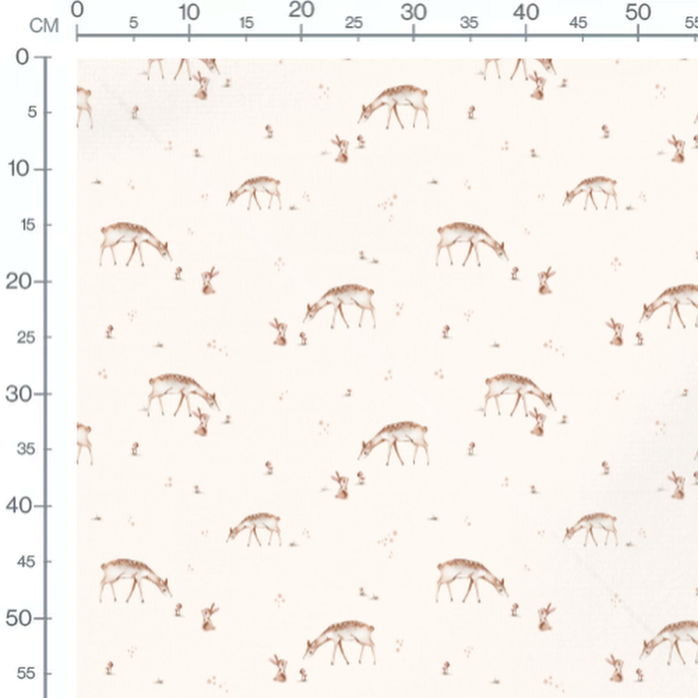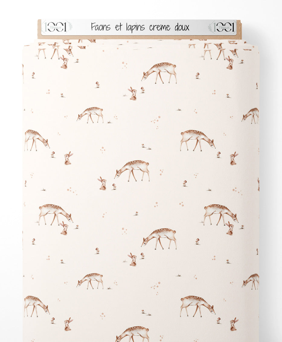 Les faons sont délicatement dessinés avec des nuances de marron. Les lapins sont assis à côté de petits champignons. Le fond crème est parsemé de petits points et détails subtils.Les tissus