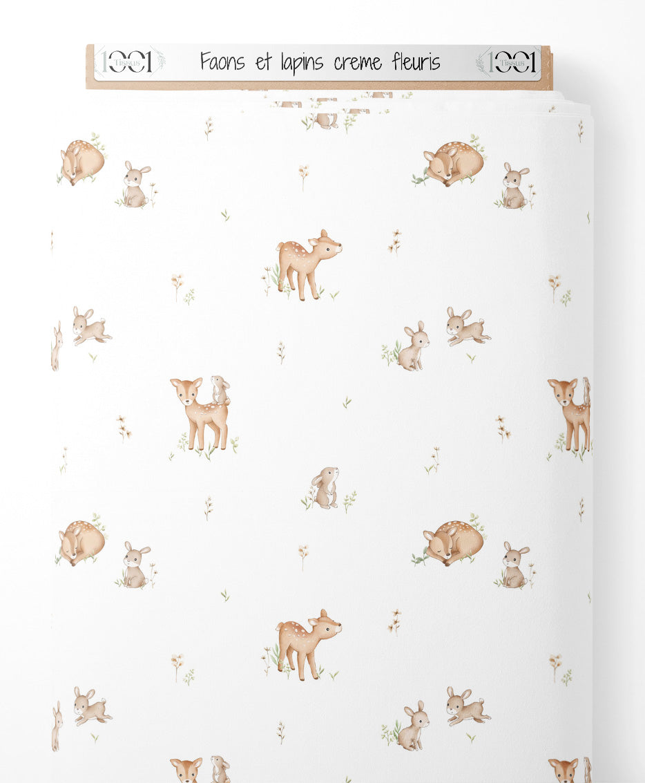 Les faons sont parsemés de taches blanches. Les lapins sont assis ou en mouvement. Les fleurs sont délicates et de couleur crème.Les tissus