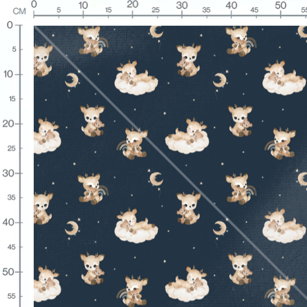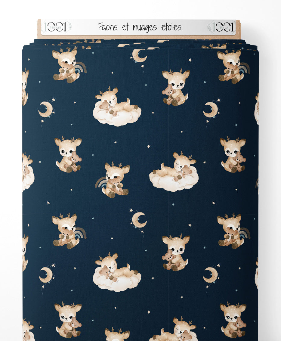 Les faons tiennent des doudous bruns et sont entourés de petits nuages blancs. Des lunes dorées et des étoiles blanches parsèment le fond bleu nuit.Les tissus