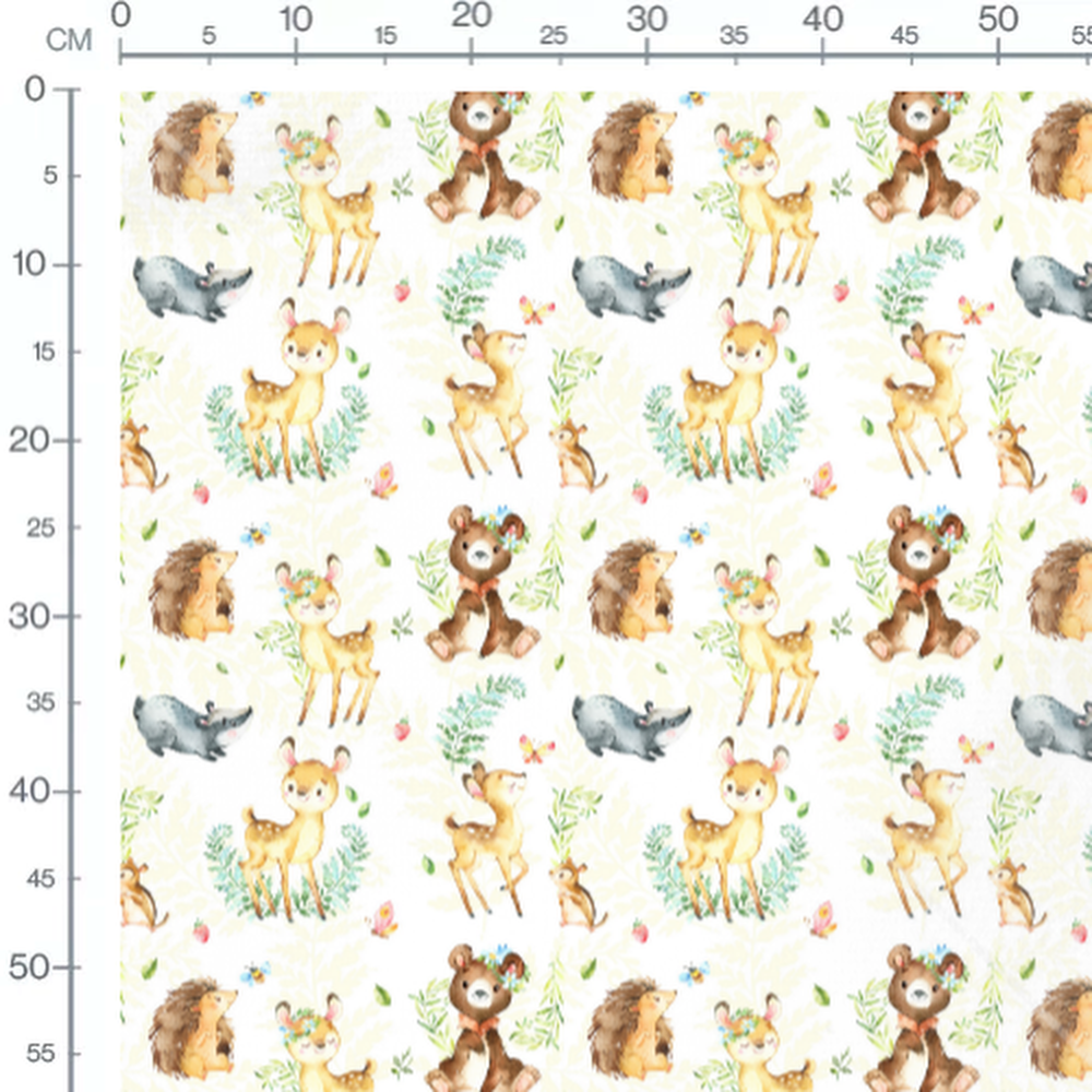 Petits papillons et fraises rouges ajoutent des touches de couleur. Les animaux sont dessinés dans un style aquarelle doux. Les faons sont entourés de feuillages délicats. Les hérissons et les ours apportent une ambiance chaleureuse.Les tissus