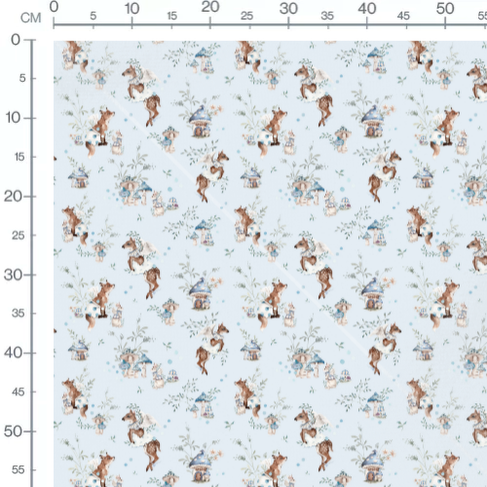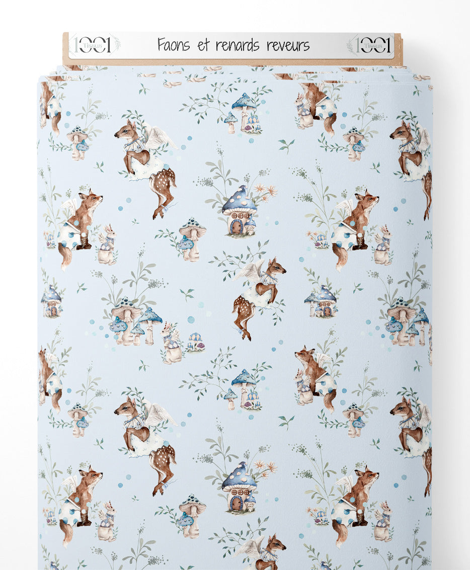 Les renards et les faons sont entourés de champignons aux teintes bleues et de petites maisons champignons. Des feuillages fins ajoutent une touche de nature. Le fond bleu clair crée une ambiance douce et rêveuse.Les tissus