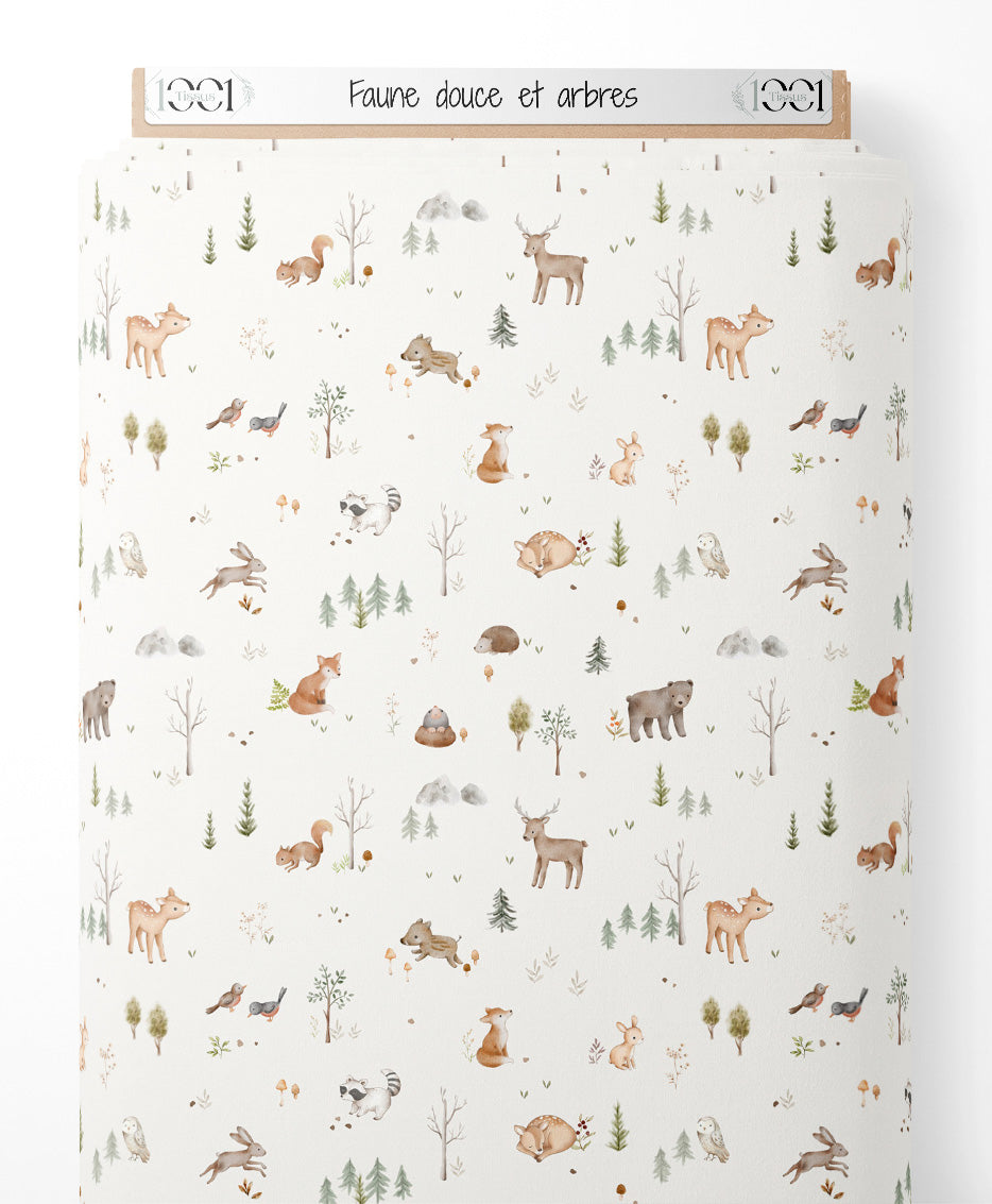 Des hiboux et des lapins se mêlent aux ratons laveurs et aux ours. Des arbres et des buissons complètent le paysage forestier.Les tissus