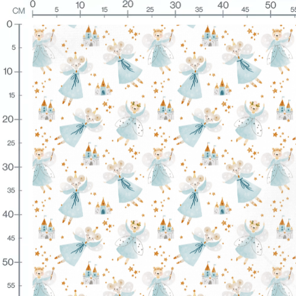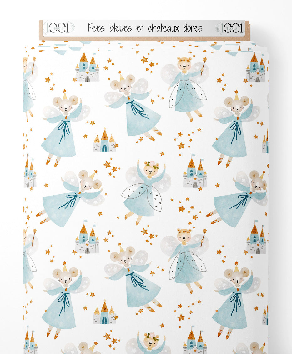 Les fées portent des robes bleues et des ailes transparentes. Les châteaux ont des toits dorés et des murs gris. Des étoiles dorées ajoutent une touche magique au motif.Les tissus