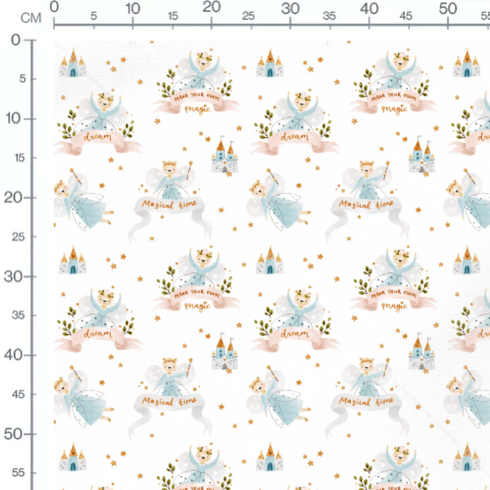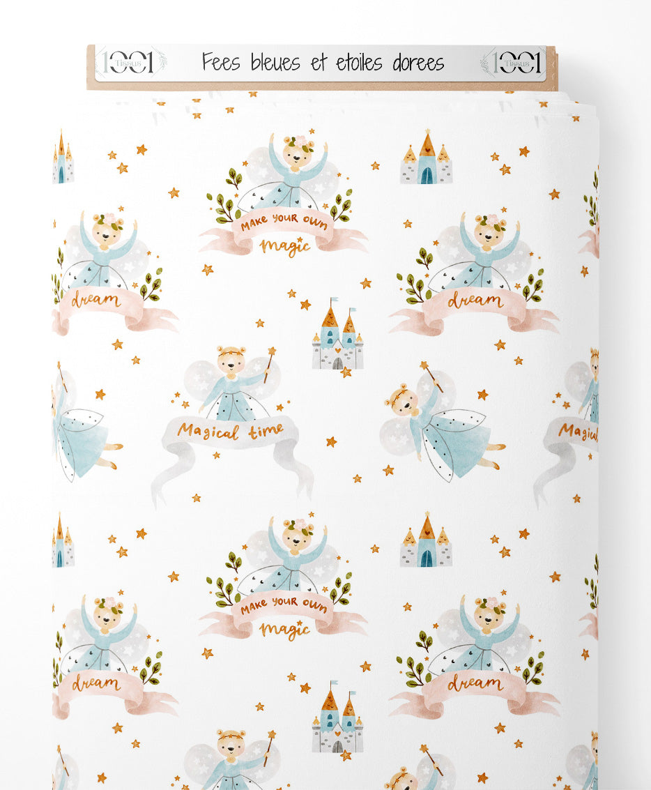 Les fées tiennent des baguettes magiques et sont entourées de bannières avec des inscriptions. Les châteaux ont des toits orange et des murs bleus. Petites étoiles dorées ajoutent une touche de magie.Les tissus