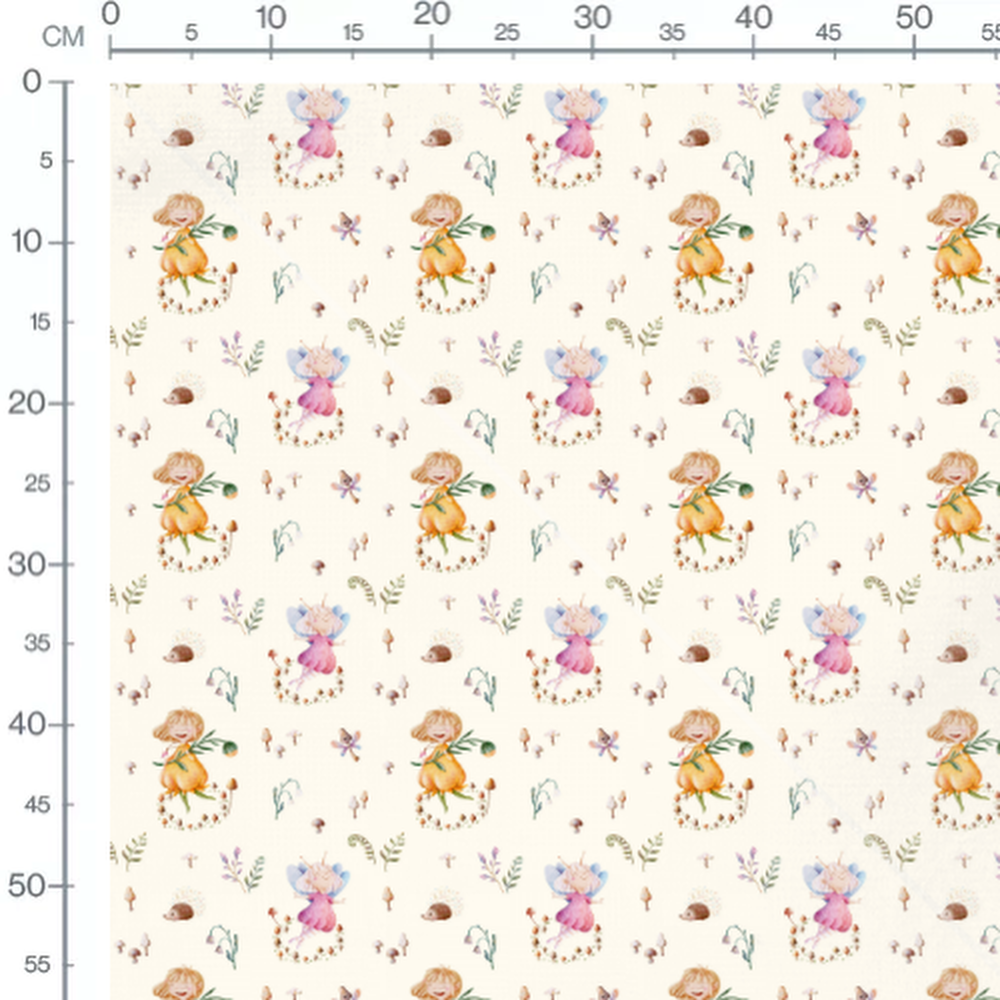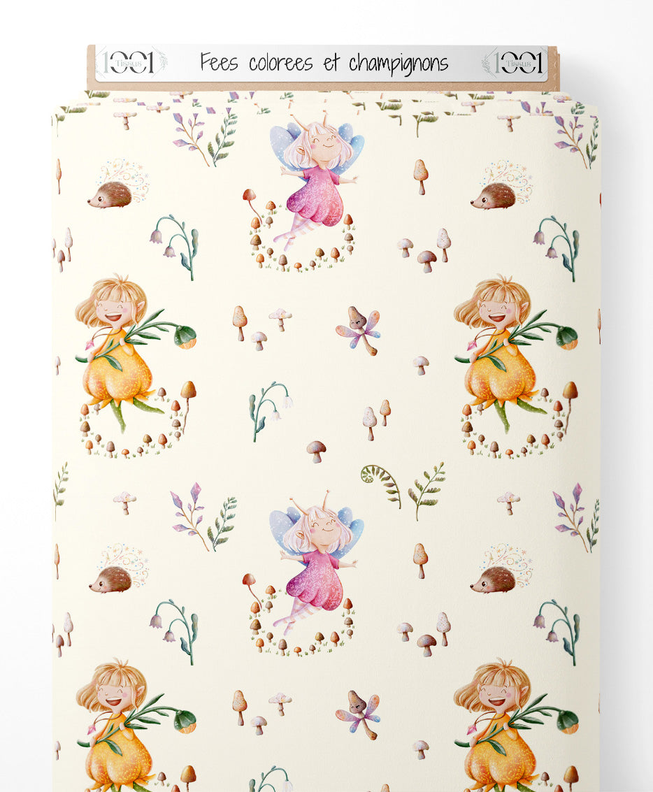 Les fées portent des robes aux teintes vives entourées de petits champignons. Un hérisson se promène parmi les fleurs délicates. Une libellule aux ailes translucides vole près des feuillages. Les éléments sont dispersés sur un fond crème apaisant.Les tissus