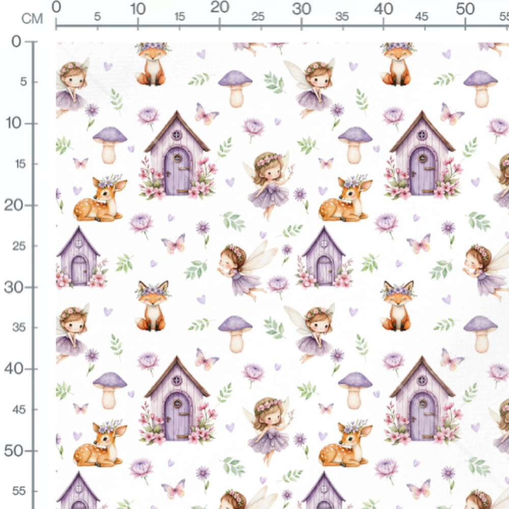 Petites maisons en bois entourées de fleurs et de papillons colorés. Renards et faons avec des couronnes de fleurs. Cœurs et feuilles vertes ajoutent une touche de douceur.Les tissus