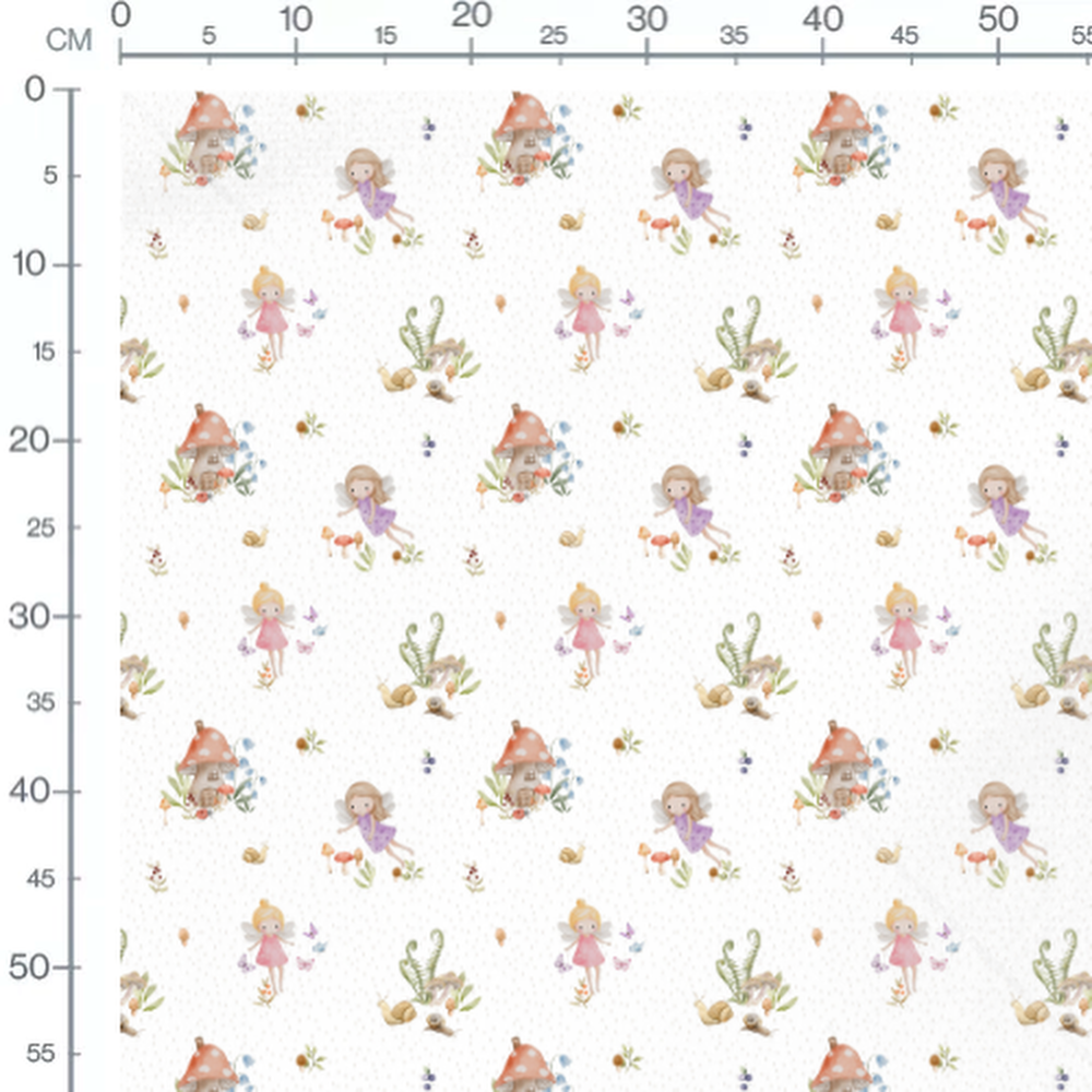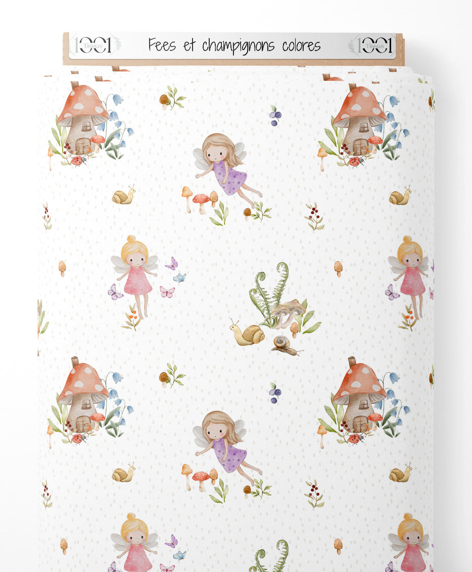 Deux fées avec des ailes transparentes et des robes roses et violettes. Champignons rouges et orange avec des escargots jaunes. Petites fleurs bleues et violettes dispersées.Les tissus