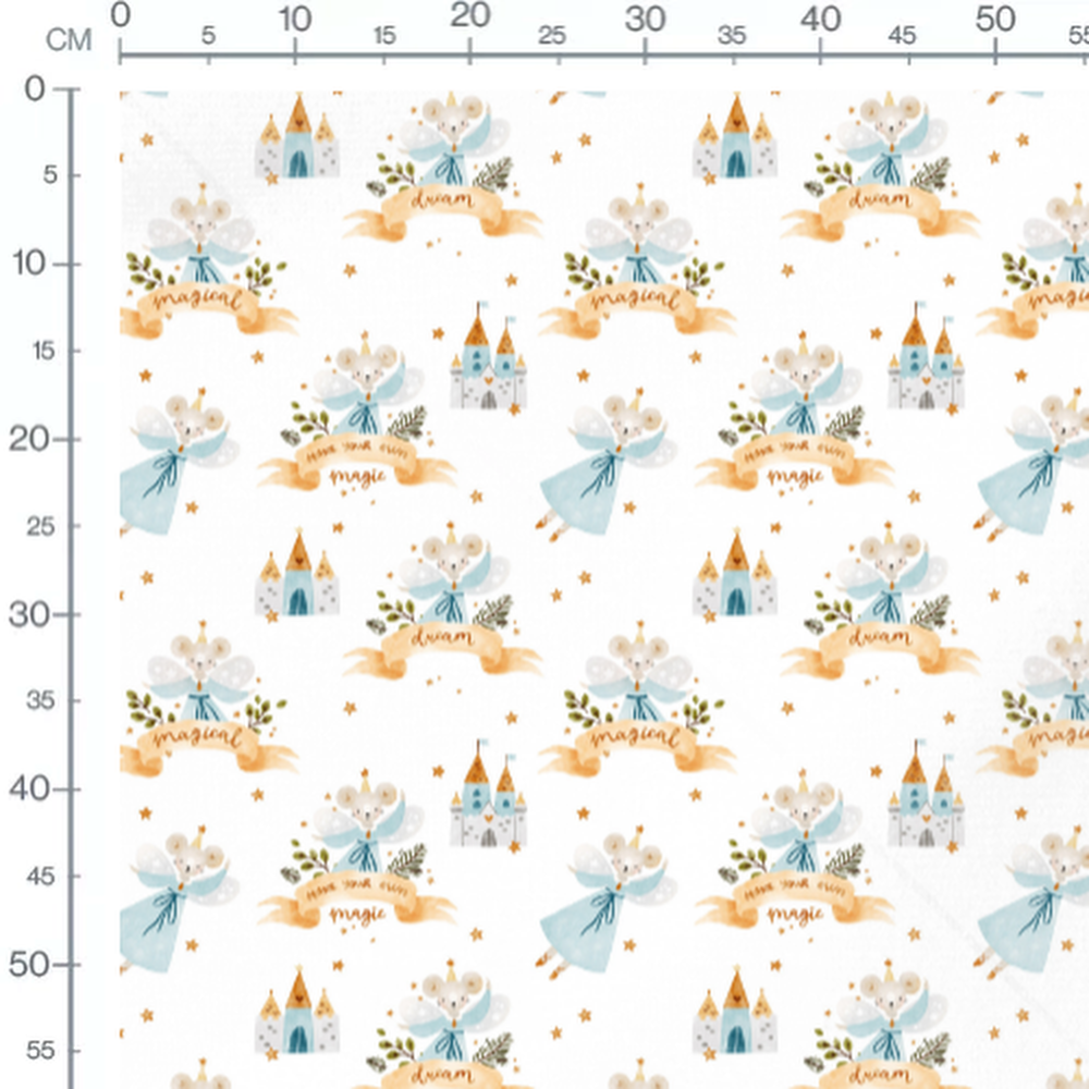 Les fées portent des robes bleues et tiennent des bannières avec des mots inspirants. Les châteaux sont ornés de tours dorées et bleues. Des branches vertes accompagnent les motifs féeriques.Les tissus