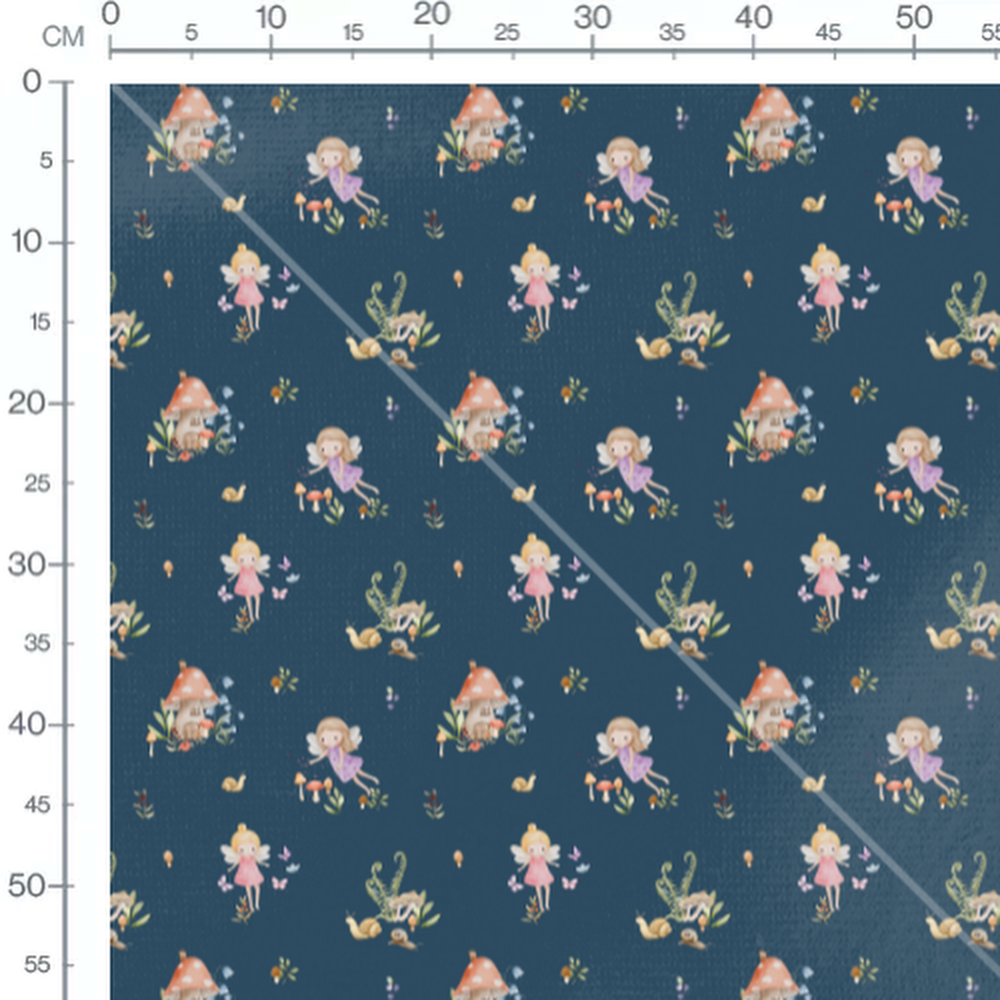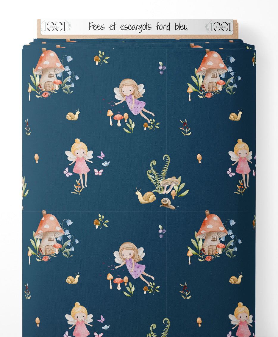 Tissu - Fées et escargots sur fond bleu