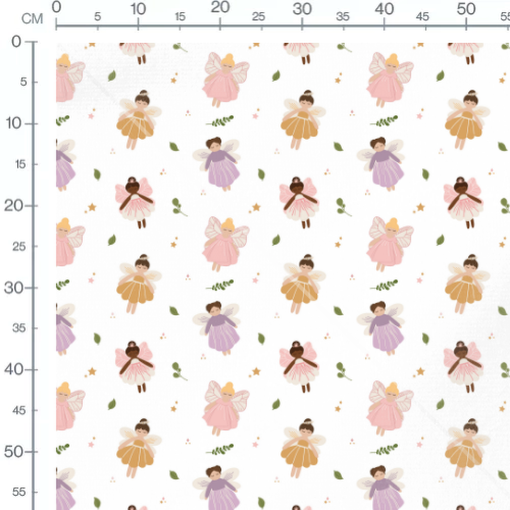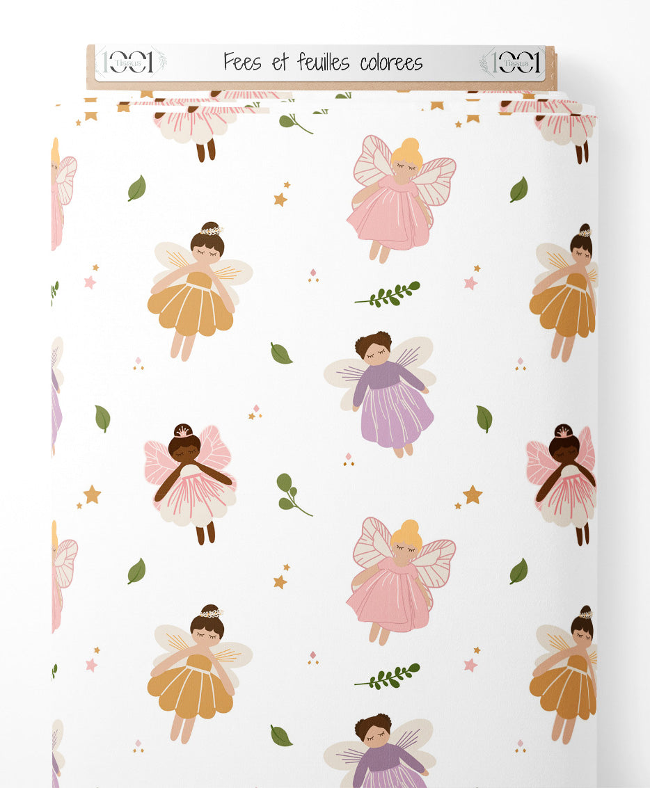 Les fées portent des robes dans des tons de rose, violet et beige. De petites étoiles dorées et des feuilles vertes complètent le motif. Les fées ont des ailes délicates et des coiffures variées.Les tissus