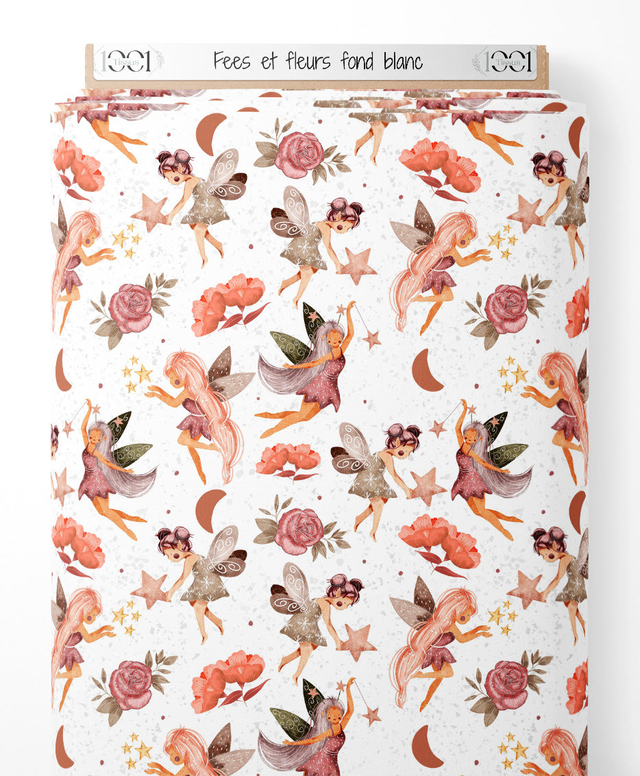 Les fées portent des robes scintillantes et ont des cheveux longs. Les fleurs sont accompagnées de feuilles vertes et brunes. Des étoiles et des croissants de lune ajoutent une touche magique.Les tissus