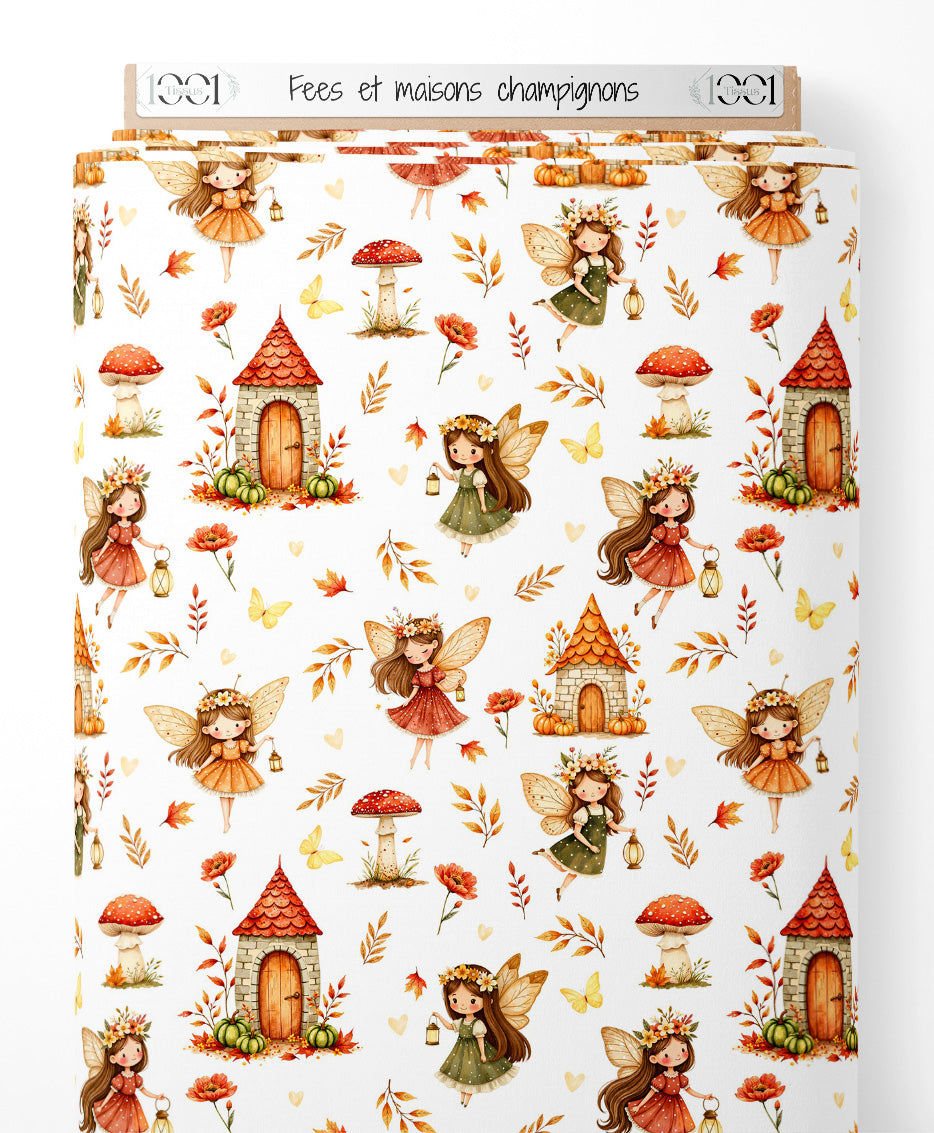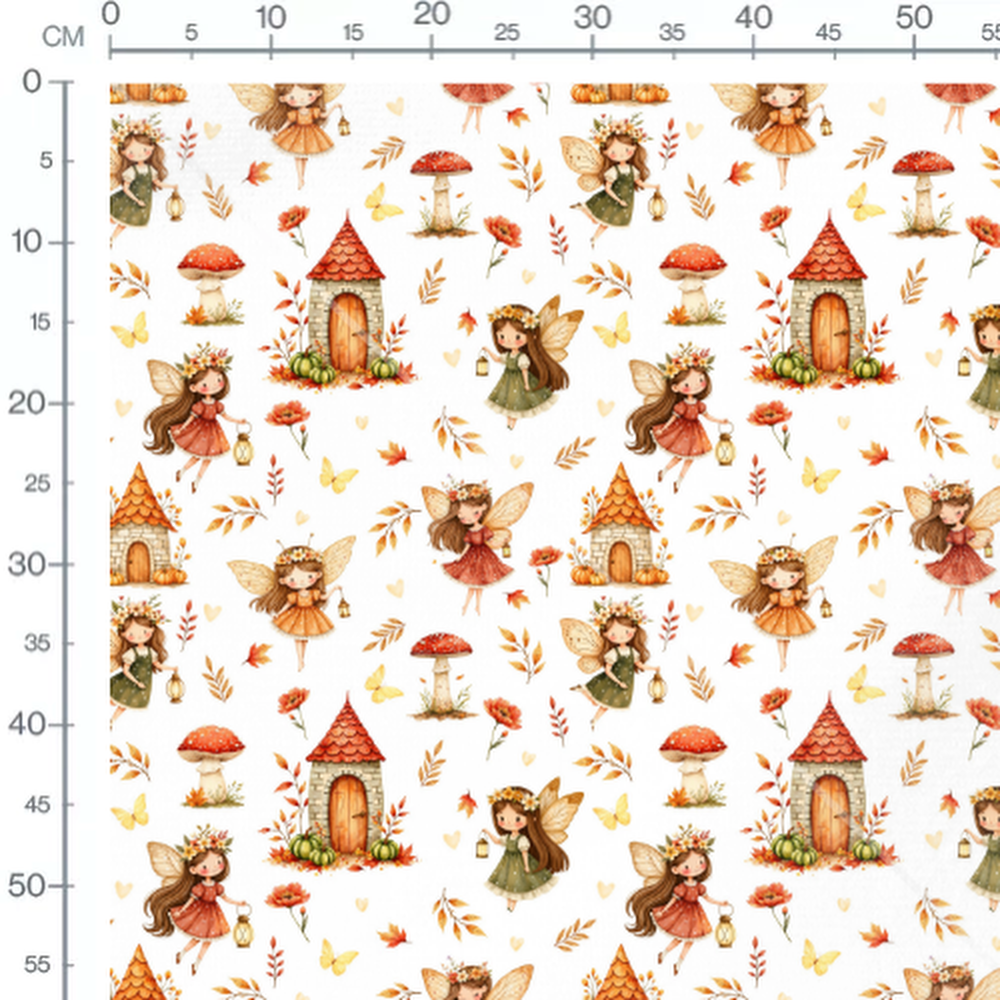 Les fées portent des robes dans des tons de vert et orange. Les maisons en pierre ont des toits rouges et sont décorées de citrouilles. Des papillons jaunes volent autour des fleurs rouges et des feuilles dorées.Les tissus