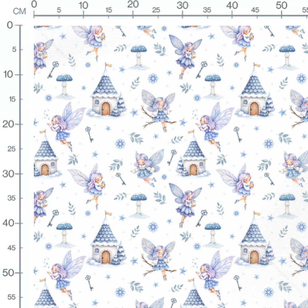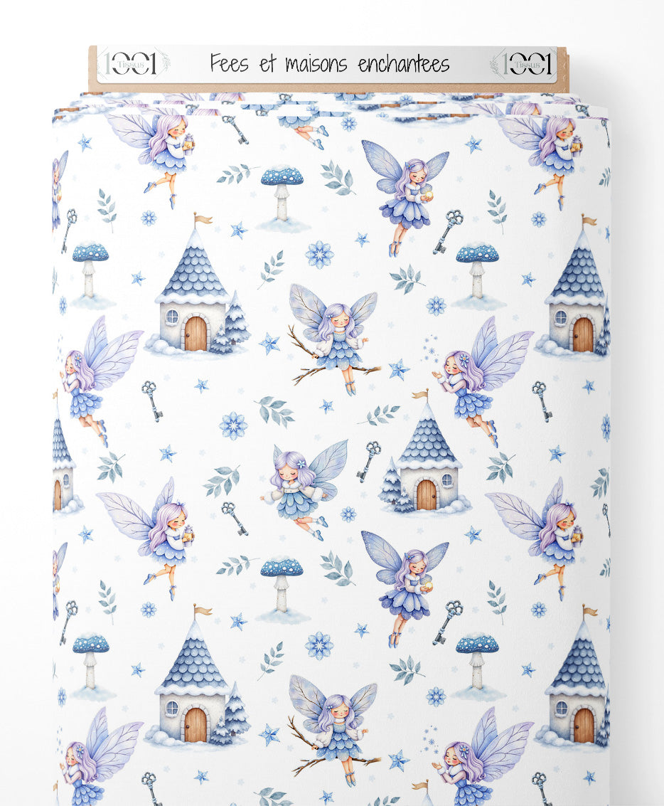 Les fées portent des robes bleues et tiennent des objets magiques. Les maisons ont des toits en forme de cône avec des drapeaux. Des branches avec des feuilles vertes et des flocons de neige complètent le motif.Les tissus