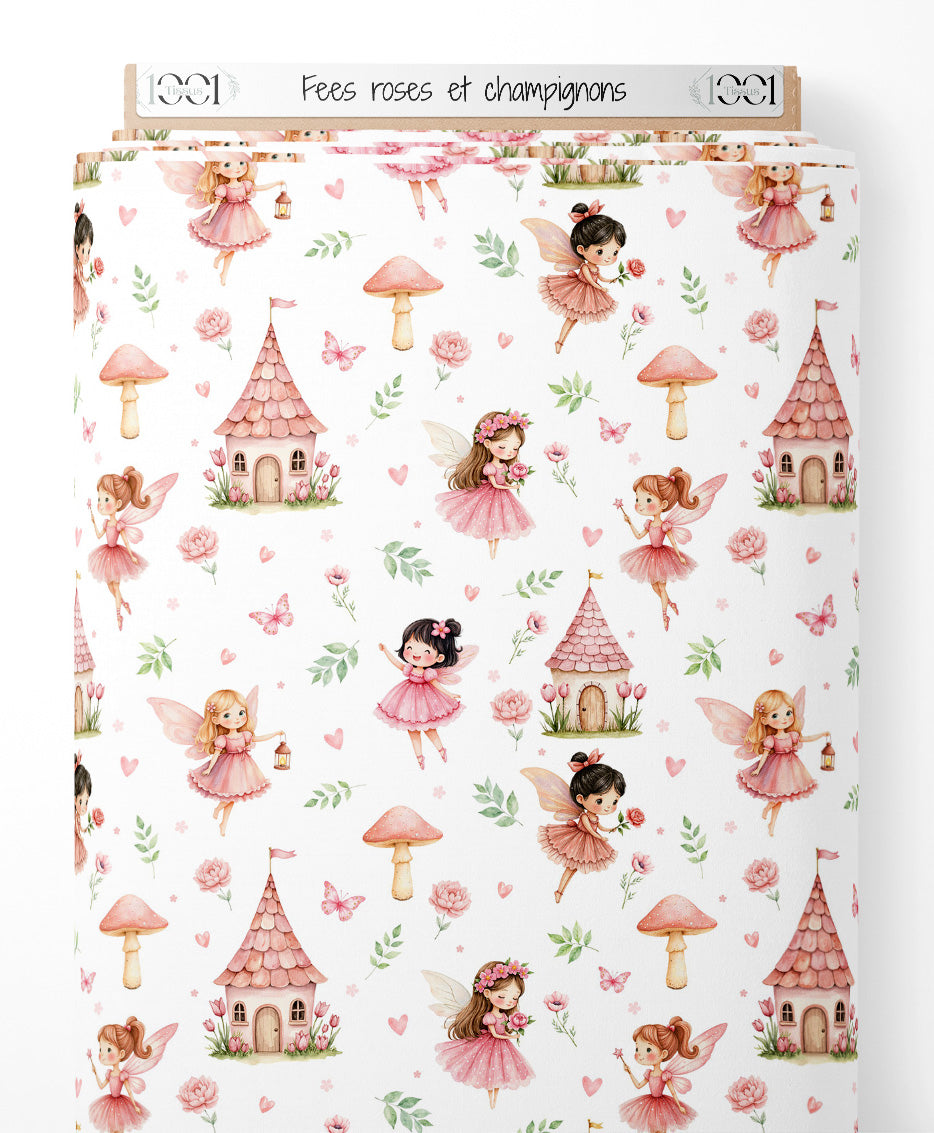 Les fées portent des robes roses et sont entourées de champignons aux teintes similaires. Des fleurs roses et des papillons ajoutent une touche délicate. De petits cœurs roses sont dispersés sur le fond blanc. Les éléments végétaux incluent des feuilles vertes claires.Les tissus