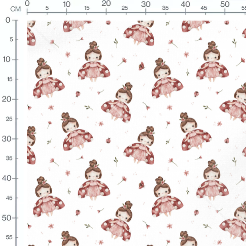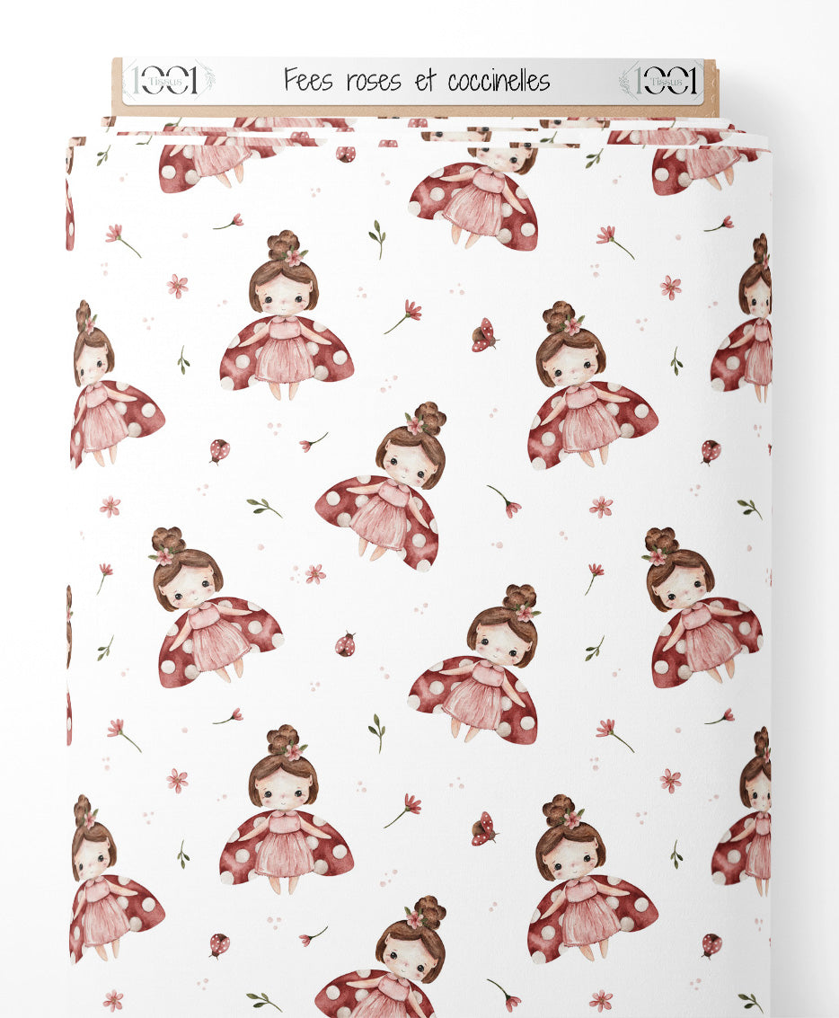 Les fées portent des robes roses et des ailes rouges à pois blancs. De petites fleurs rouges et des coccinelles ajoutent une touche de couleur. Les éléments sont délicatement dessinés dans des tons pastel.Les tissus