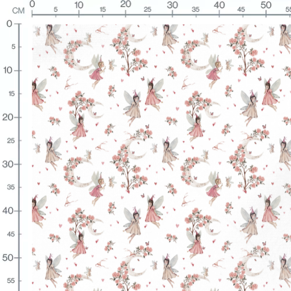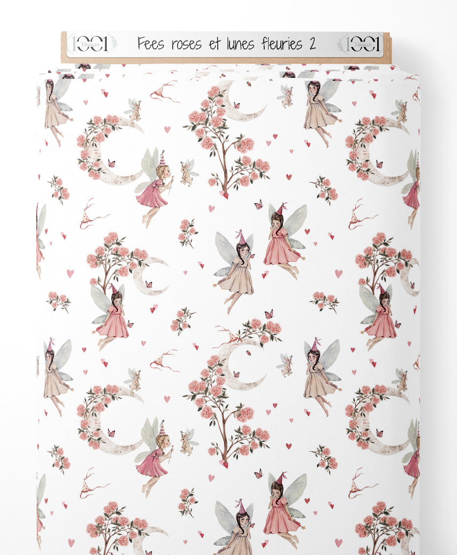 Les fées portent des chapeaux pointus et sont entourées de papillons. Les fleurs sont délicatement dessinées avec des détails fins. Les lunes sont ornées de motifs floraux et de petits cœurs.Les tissus