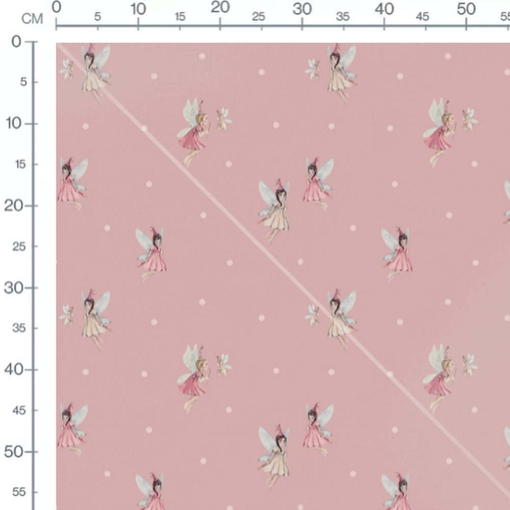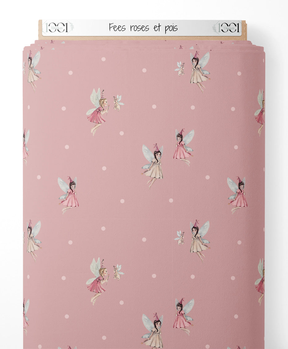 Les fées portent des chapeaux pointus assortis à leurs robes. Le fond rose est parsemé de pois blancs réguliers.Les tissus