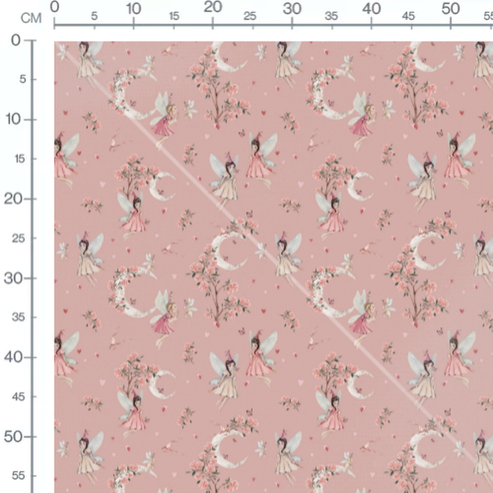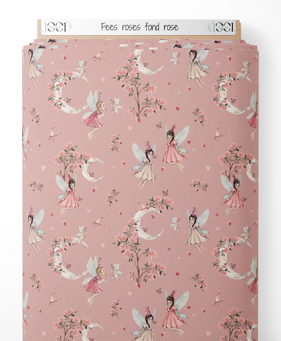 Petits cœurs roses et papillons ajoutent des détails délicats. Les fées portent des chapeaux pointus et ont des ailes translucides. Les fleurs sont regroupées autour de croissants de lune blancs.Les tissus