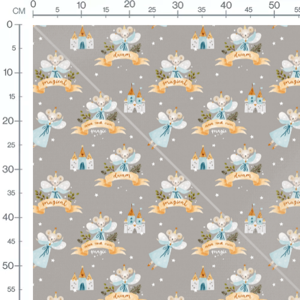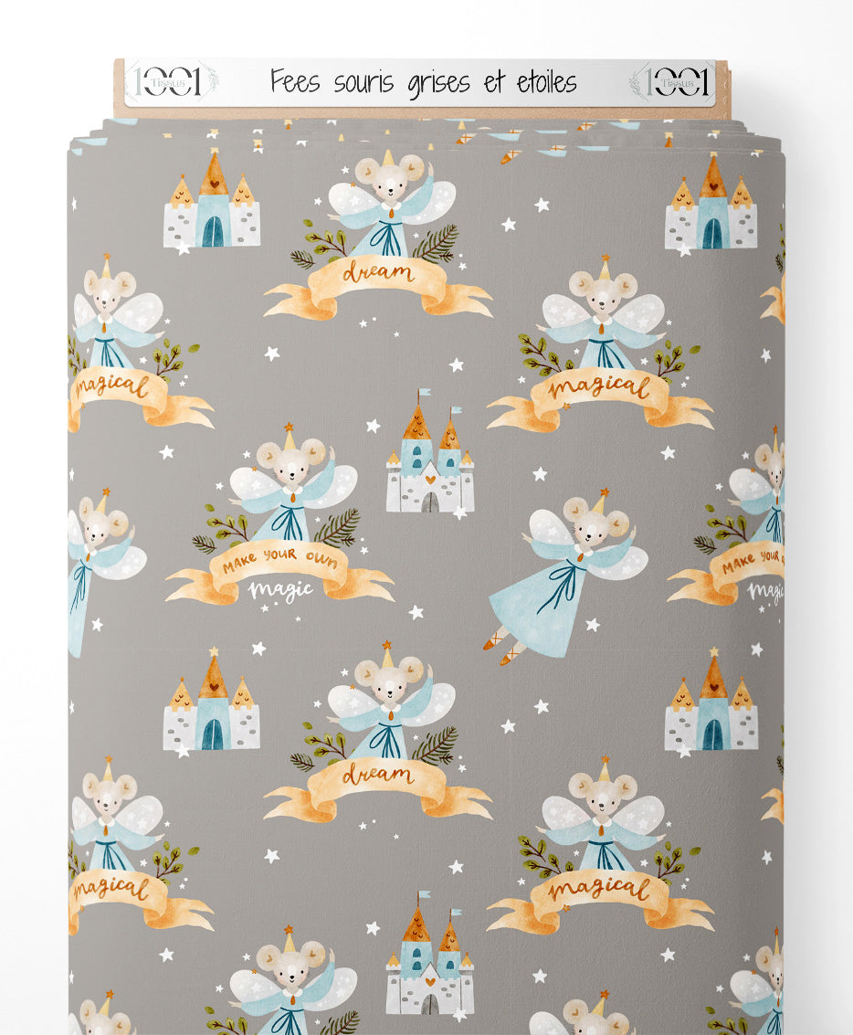 Les fées souris portent des robes bleues et tiennent des bannières avec des mots inspirants. Les châteaux sont ornés de tours dorées et de drapeaux bleus. Des étoiles blanches parsèment le fond gris.Les tissus
