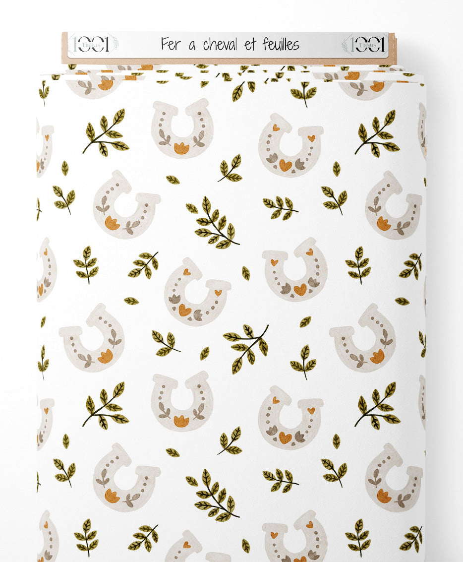 Les fers à cheval sont ornés de petits motifs floraux dans des tons beiges et marron. Les branches de feuilles vertes ajoutent une touche naturelle au motif.Les tissus