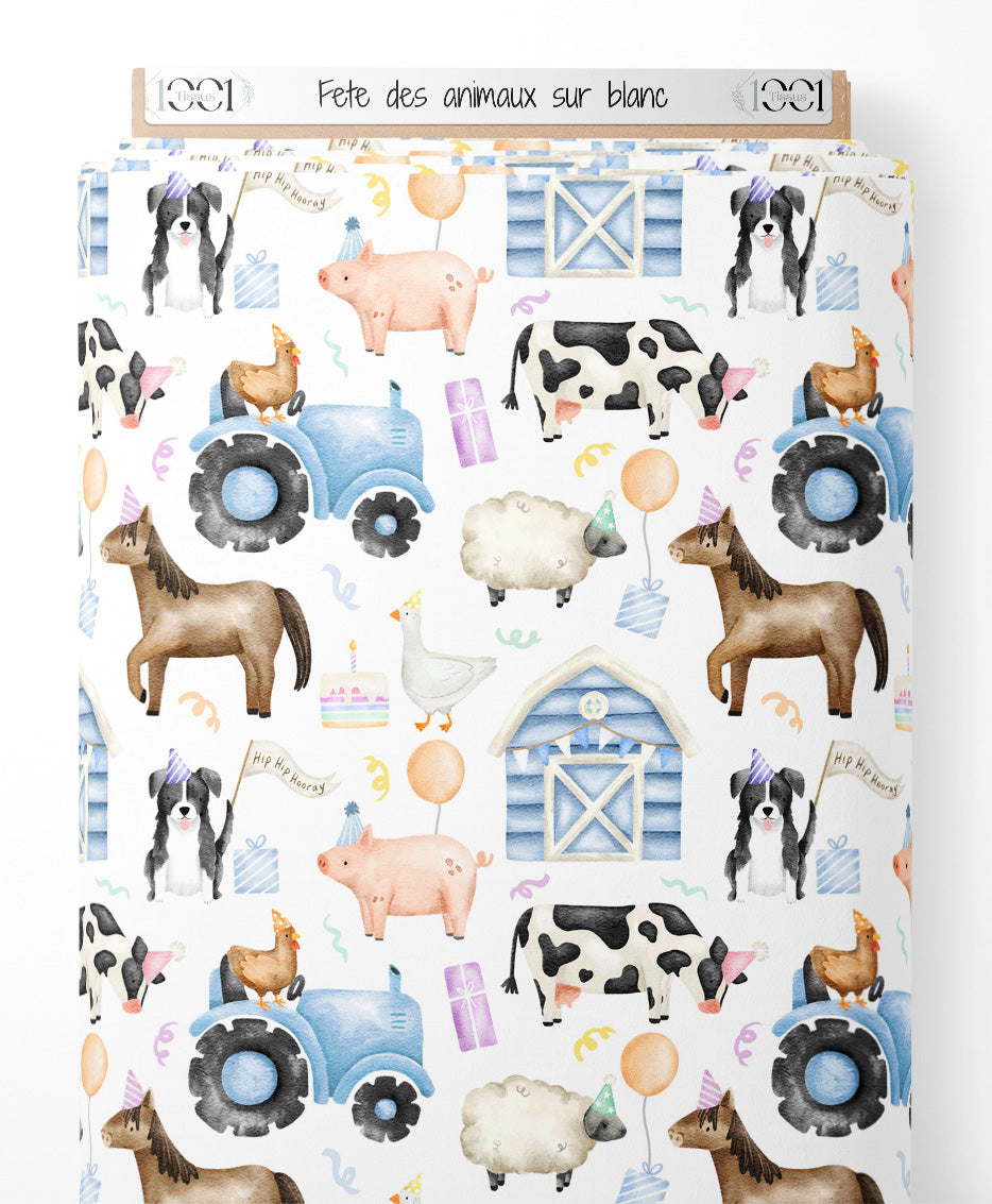 Cadeaux et gâteau d'anniversaire dispersés parmi les animaux. Vache, cochon, cheval et mouton en fête. Rubans et confettis ajoutent une touche festive.Les tissus