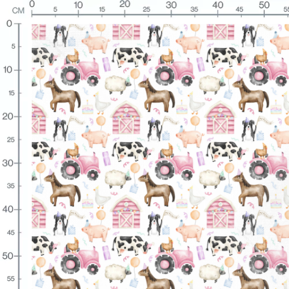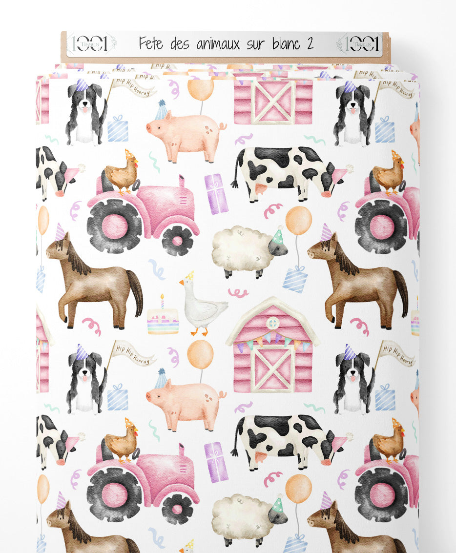 Un chien, un cochon, une vache, un cheval, une poule, un mouton et une oie portent des chapeaux de fête. Un tracteur rose et des éléments festifs comme des ballons et des gâteaux complètent le motif.Les tissus