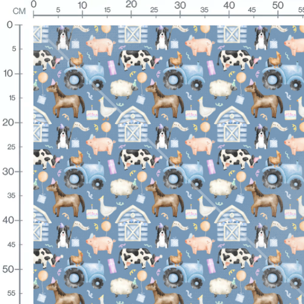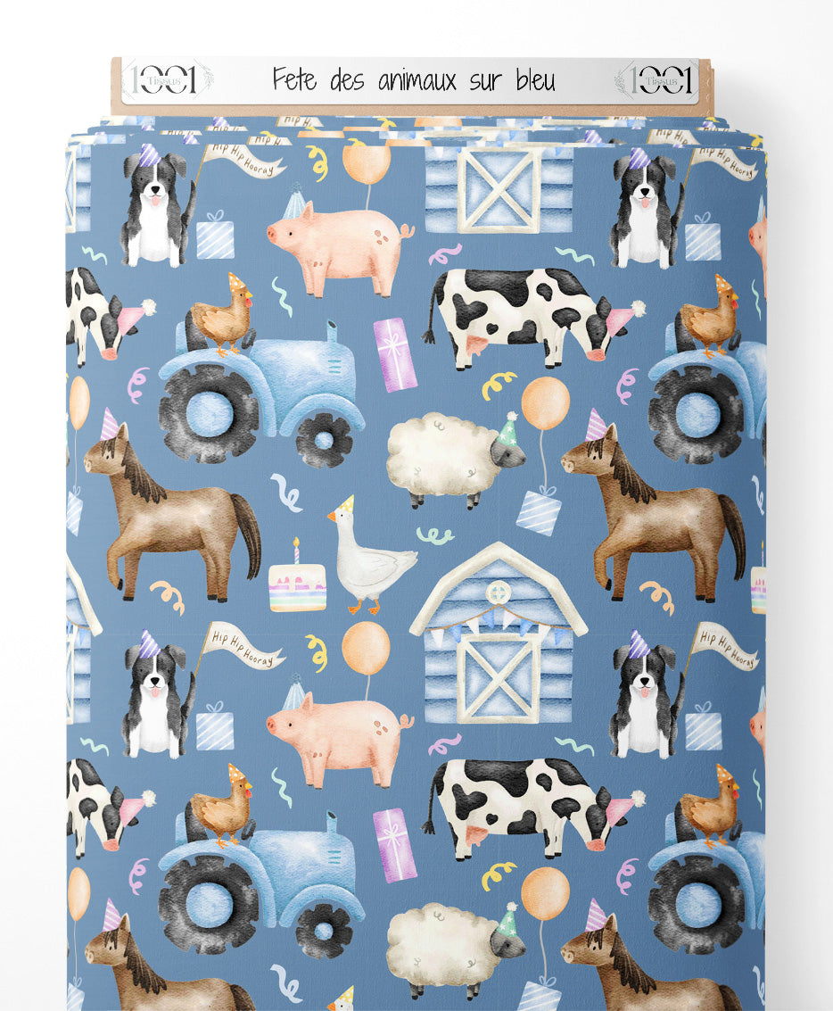 Un chien, un cochon, une vache, un cheval, une poule, un mouton et une oie portent des chapeaux de fête. Un tracteur bleu et des éléments festifs comme des ballons et des cadeaux sont dispersés sur le fond bleu.Les tissus