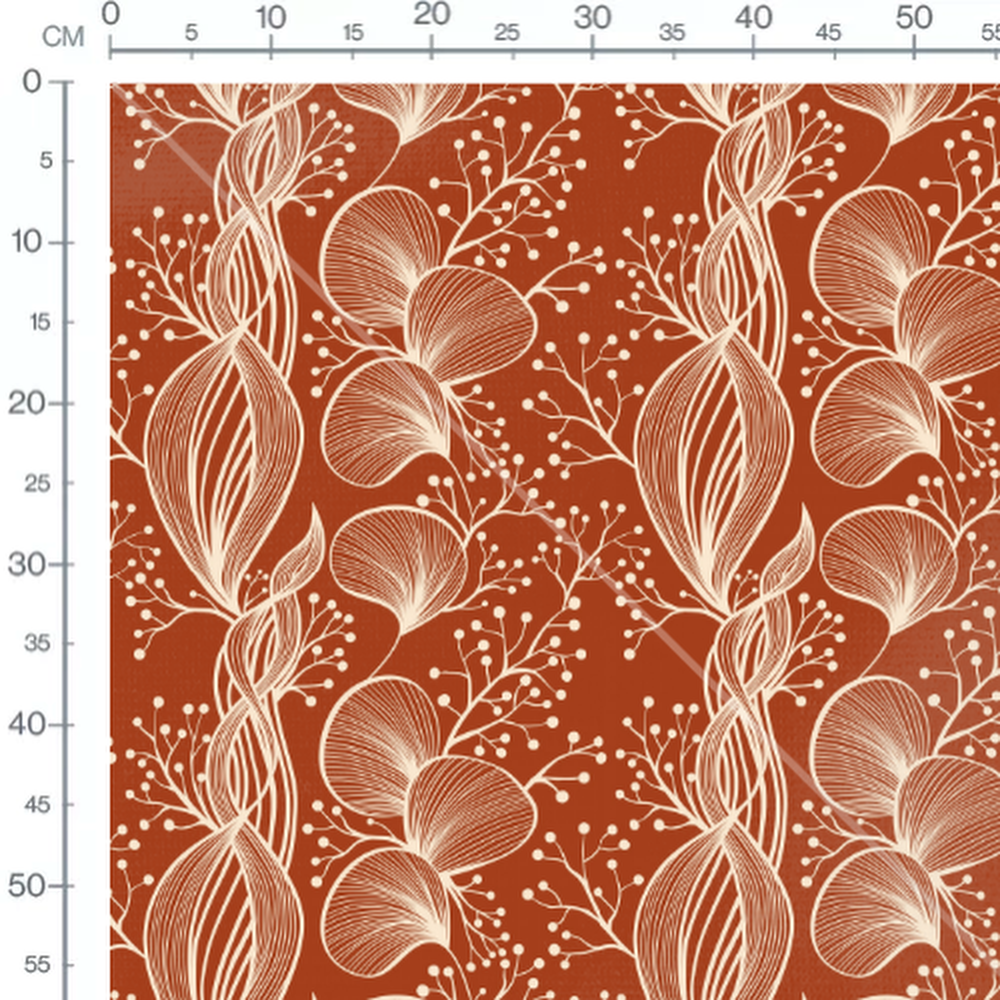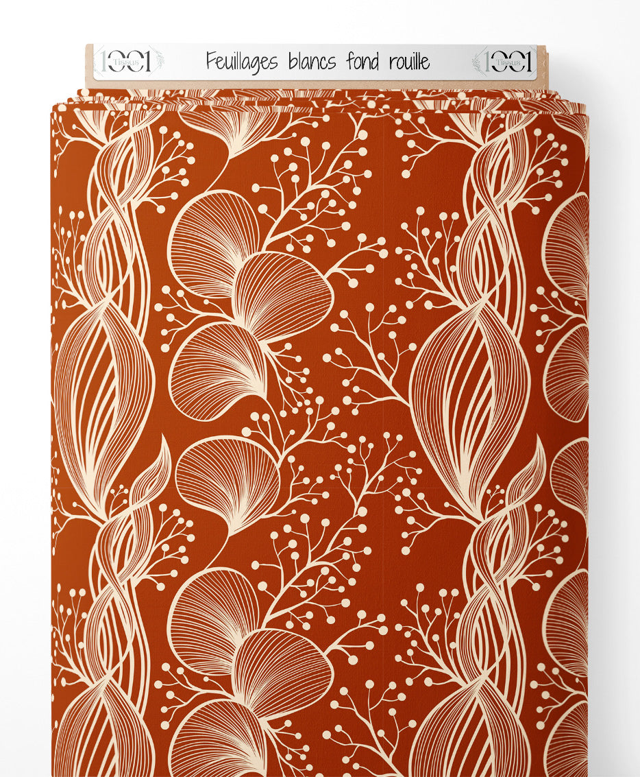 Les motifs floraux sont composés de lignes blanches délicates. Les lignes courbes créent un effet de mouvement sur le fond rouille.Les tissus