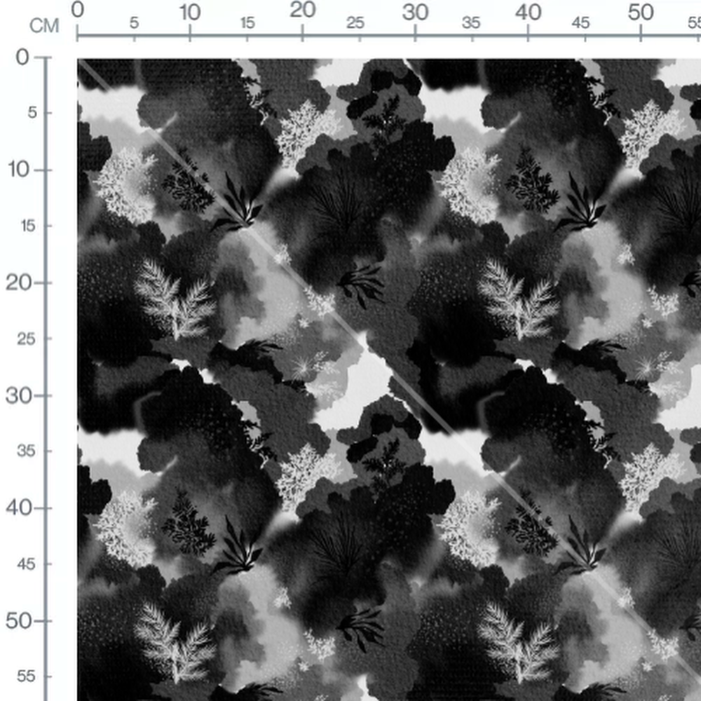 Les feuillages sont variés et stylisés, créant un effet artistique. Le fond nuageux ajoute de la profondeur au motif. Les nuances de gris apportent un contraste subtil.Les tissus
