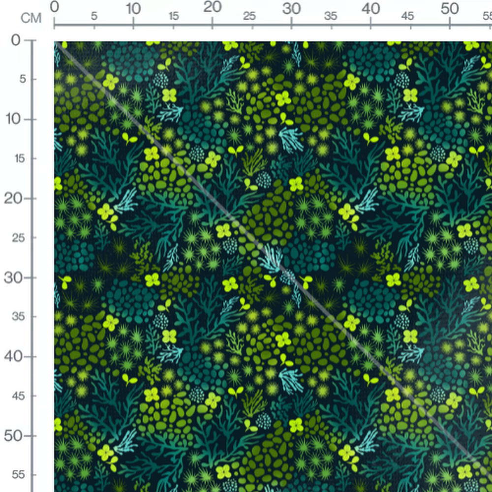 Les feuillages sont de différentes nuances de vert. Les fleurs jaunes ajoutent une touche lumineuse. Les petites étoiles vertes créent un effet scintillant.Les tissus