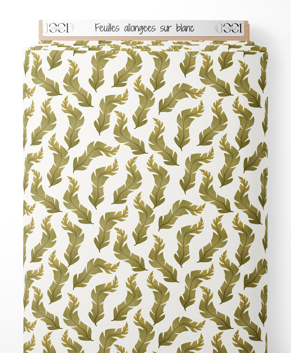 Les feuilles sont de couleur verte avec des détails en nuances. Le fond blanc met en valeur les motifs naturels.Les tissus
