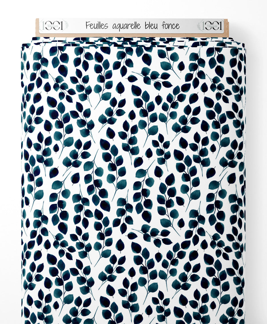 Les feuilles sont disposées de manière dense, créant un effet de forêt. Chaque feuille présente des nuances de bleu, accentuant l'effet aquarelle. Le fond blanc met en valeur la profondeur des couleurs des feuilles.Les tissus