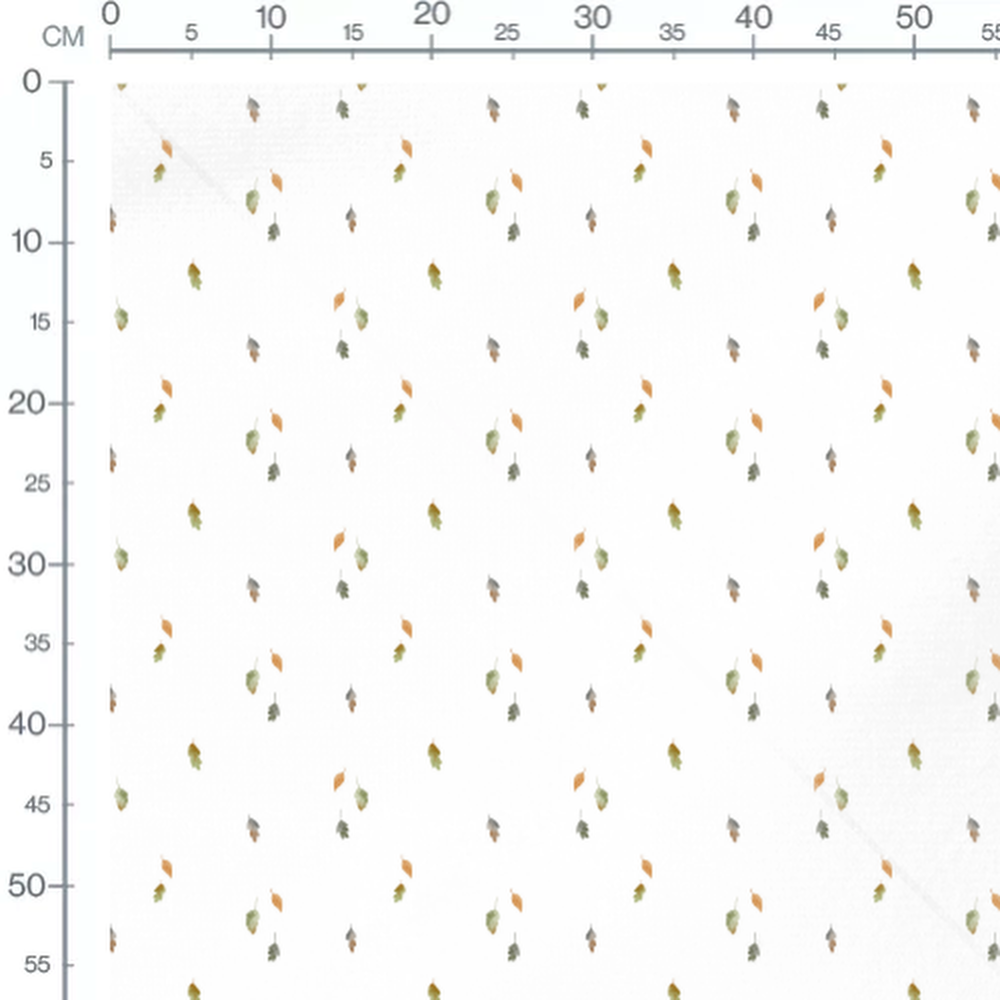 Les feuilles sont dispersées avec des nuances de vert, orange, gris et brun. Chaque feuille présente une texture aquarelle délicate.Les tissus