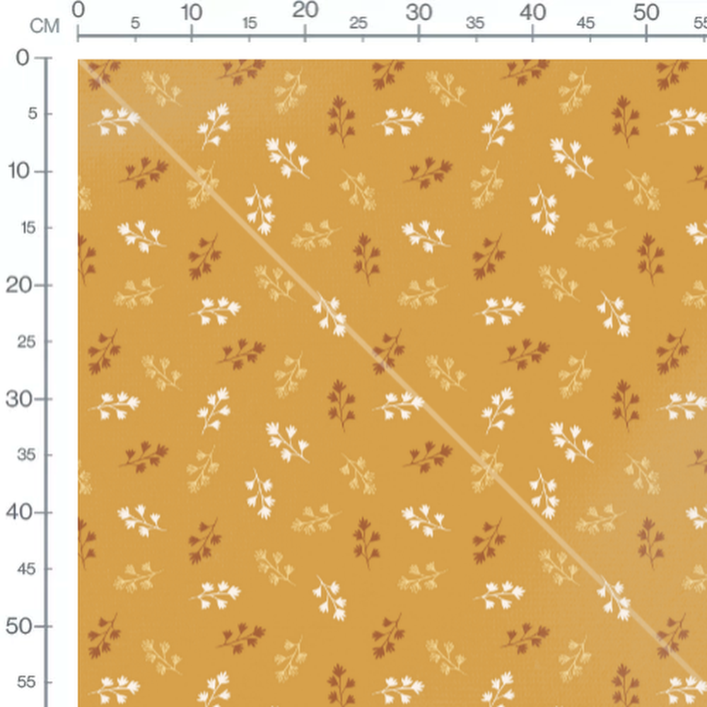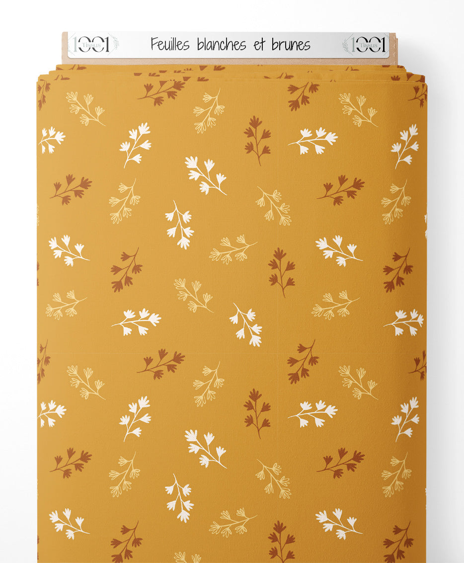 Les feuilles blanches et brunes sont dispersées uniformément. Le fond ocre met en valeur les détails des feuilles. Les nuances de brun ajoutent de la profondeur au motif.Les tissus