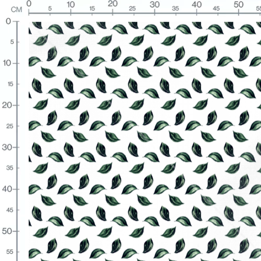 Les feuilles sont de différentes nuances de vert, allant du vert foncé au vert clair. Chaque feuille présente des détails subtils, ajoutant de la profondeur au motif. Le fond blanc met en valeur les couleurs des feuilles.Les tissus