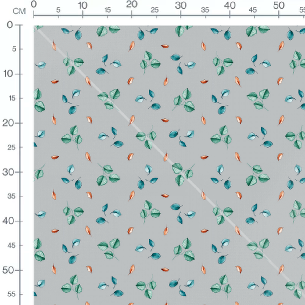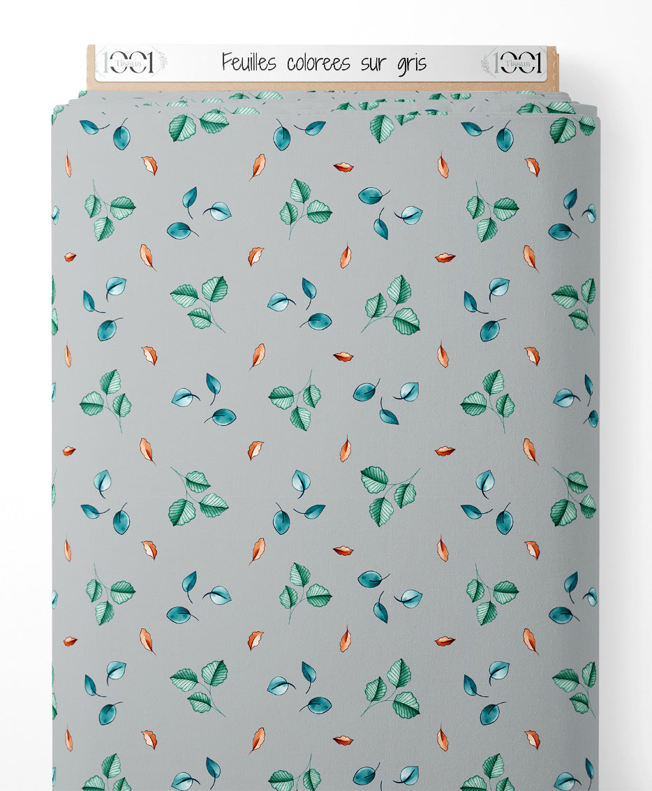 Les feuilles vertes sont détaillées avec des nervures. Les feuilles bleues ont une teinte aquatique. Les petites feuilles orange ajoutent une touche de contraste.Les tissus