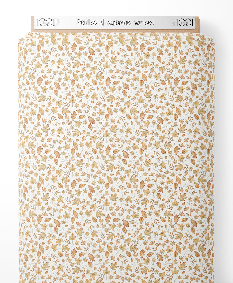 Les feuilles sont de différentes tailles et formes, typiques de l'automne. Les couleurs varient du marron clair à l'orange foncé, créant un motif harmonieux. Le fond blanc met en valeur les teintes chaudes des feuilles.Les tissus
